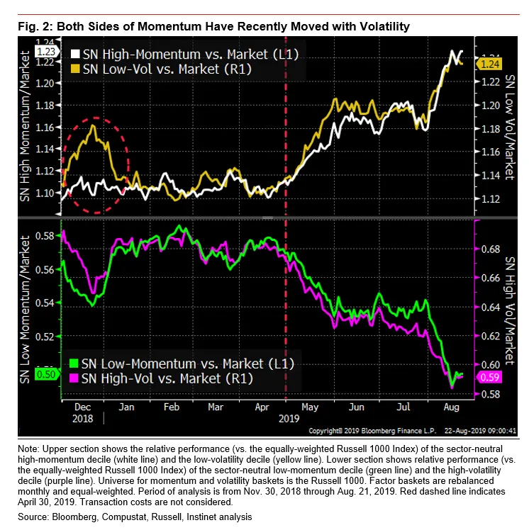 自科技泡沫以来,在超过200个观察中,仅在4个月内我们看到了极端动量的“双赢”:2002年9月、2008年6月、2019年5月和2019年8月(截至本月)。动量因子(多空)时不时会看到超额回报,但在大多数情况下,回报集中在因子的一个侧面。在上述4个月中,当动量的两个侧面都表现出大额超额回报时,动量的多头侧重于低波动性股票。换句话说,在这4个月中,动量因子(特别是多头侧,正是各种ETF的焦点)与远离高风险股票的偏见同义。当动量的多头和空头篮子都与波动性相关联,并且市场表现出强烈的风险规避观点时,动量中可能会产生超额(正向)回报。
