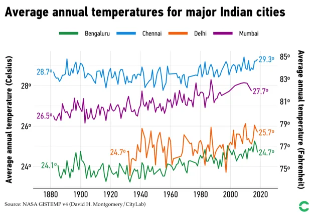 能源与资源研究所,一个总部位于德里的研究非营利组织,发现在2017年,印度许多快速发展的城市正在经历热岛现象,有些城市的变化更为迅速。(德里已经布满热岛。)城市发展——通常是无计划的,并违反当地的分区法——以及随之而来的蒸散减少是主要驱动因素。