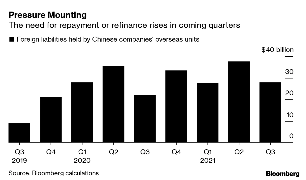 中国公司欠外国人的债务比2万亿美元的官方数据显示多出约三分之一,基于彭博社的计算。这6500亿美元的额外债务是由海外子公司积累的。其中约70%由在岸母公司及其单位等实体担保。仅2020年上半年到期的债务金额就达630亿美元。