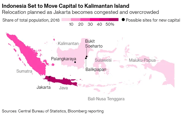 - 迁移距离雅加达约1400公里,将有助于将经济活动分散到国家人口最多的岛屿之外。这也将减轻雅加达的压力,雅加达非常拥堵且正在下沉。城市的五分之二低于海平面,部分地区每年下沉20厘米。