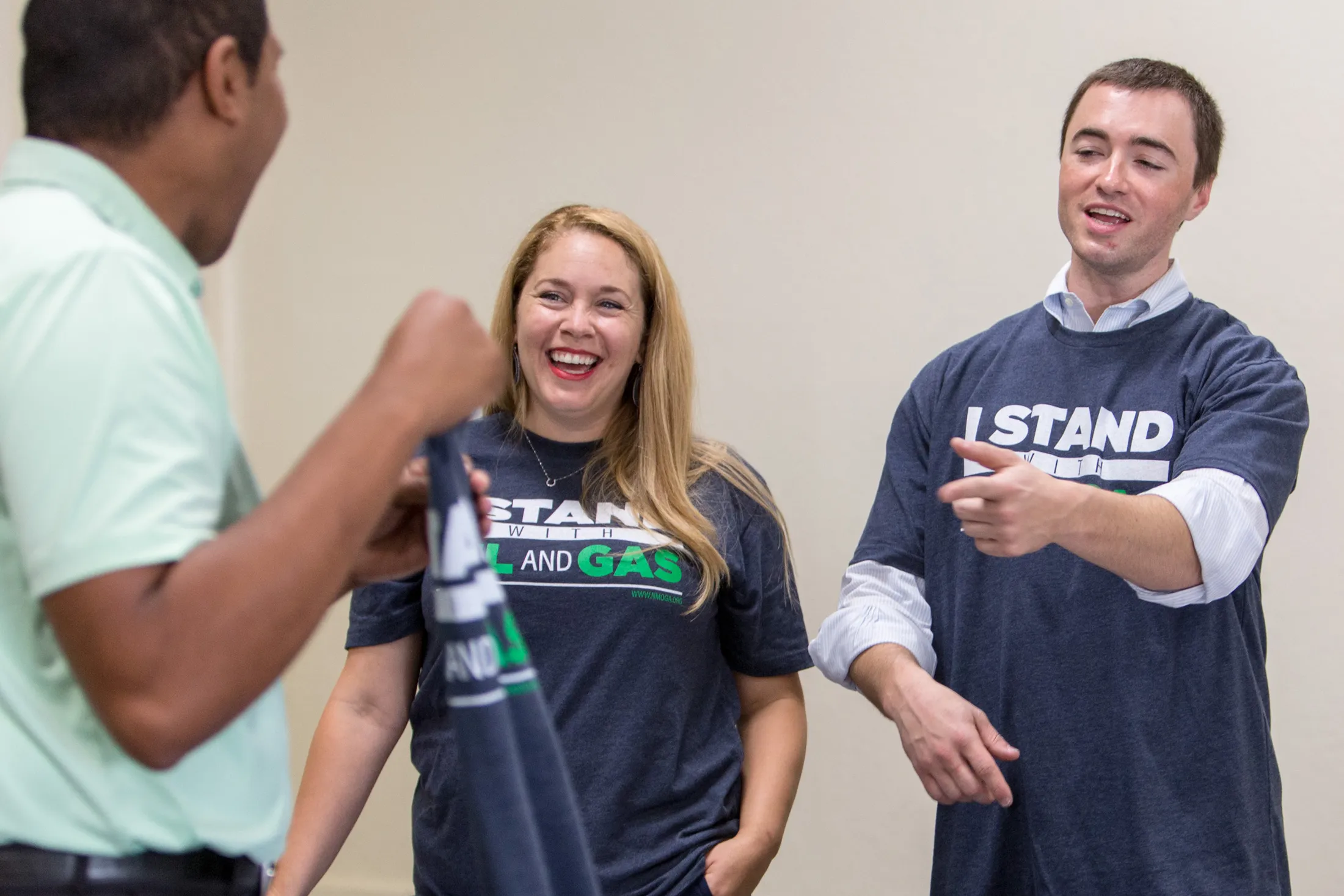 罗伯特·麦肯泰尔在8月7日的卡尔斯巴德甲烷法规公众会议前发放T恤。摄影师:史蒂文·圣约翰/彭博社新墨西哥州石油和天然气协会表示,他们对初步谈判的进展总体上感到满意。