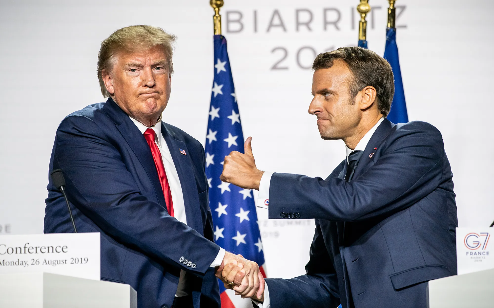 埃马纽埃尔·马克龙在8月26日G7峰会结束后的新闻发布会上伸出大拇指与唐纳德·特朗普握手。摄影师:迈克尔·卡佩勒/图片联盟通过Getty Images/图片联盟 特朗普和马克龙总统在G-7闭幕新闻发布会上。摄影师:迈克尔·卡佩勒/图片联盟通过Getty Images
