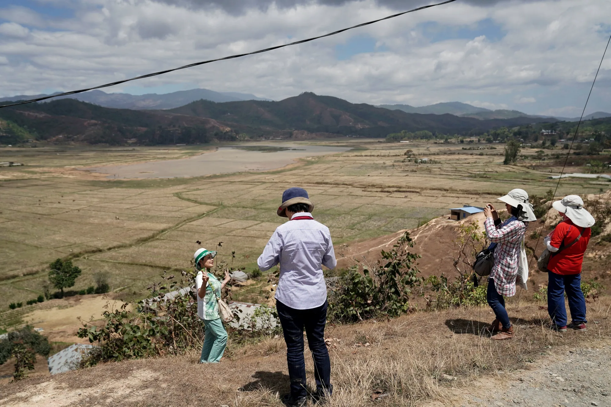 一位中国游客在塞洛伊的稻田和山脉背景下摆姿势拍照。