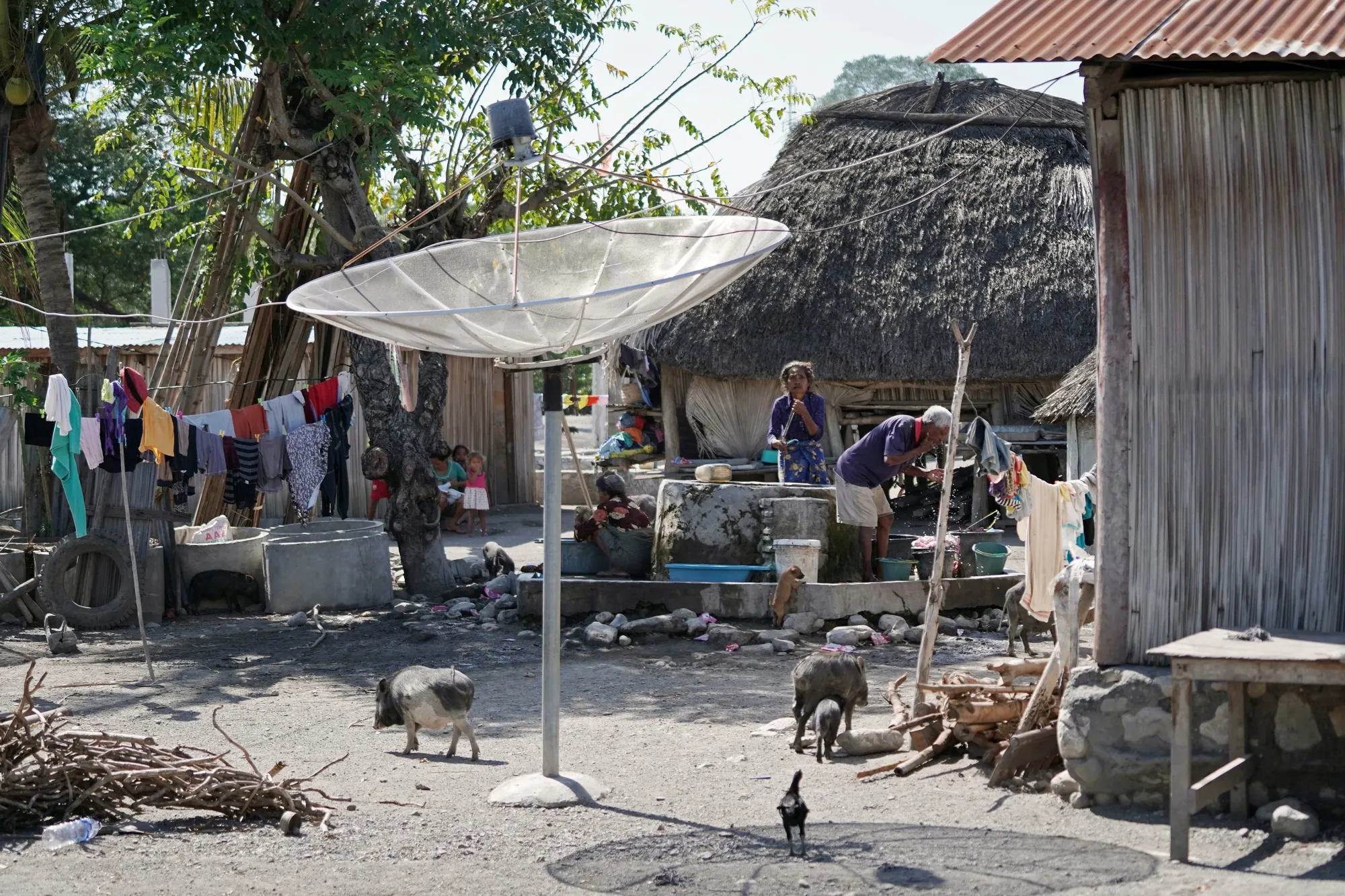 在附近的一个定居点,天线碟为苏艾的村民提供印尼电视。摄影师:迪马斯·阿尔迪安/彭博社在靠近机场的萨乌伊海滩,唯一的供应基地迹象是其粗糙的基础,渔民们在早晨捕捞后检查他们的渔网。