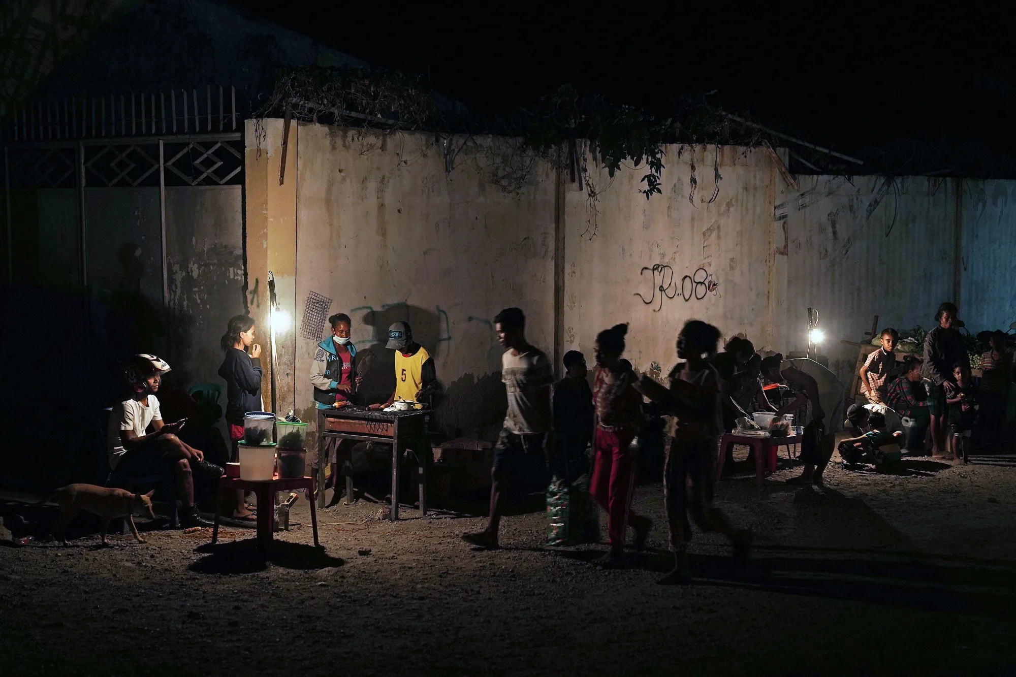 临时的停滞灯照亮了东帝汶帝力的夜市,日期是8月22日。