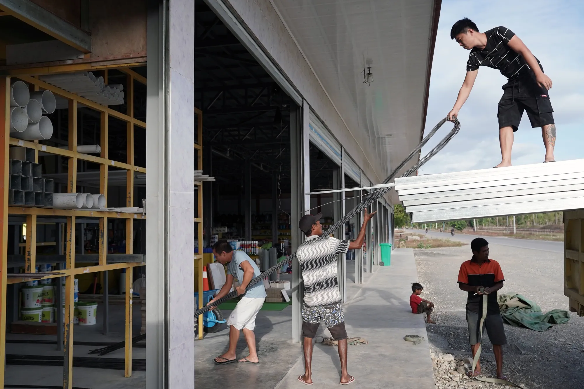 一名中国工人在靠近工地的商店卸载建筑材料。