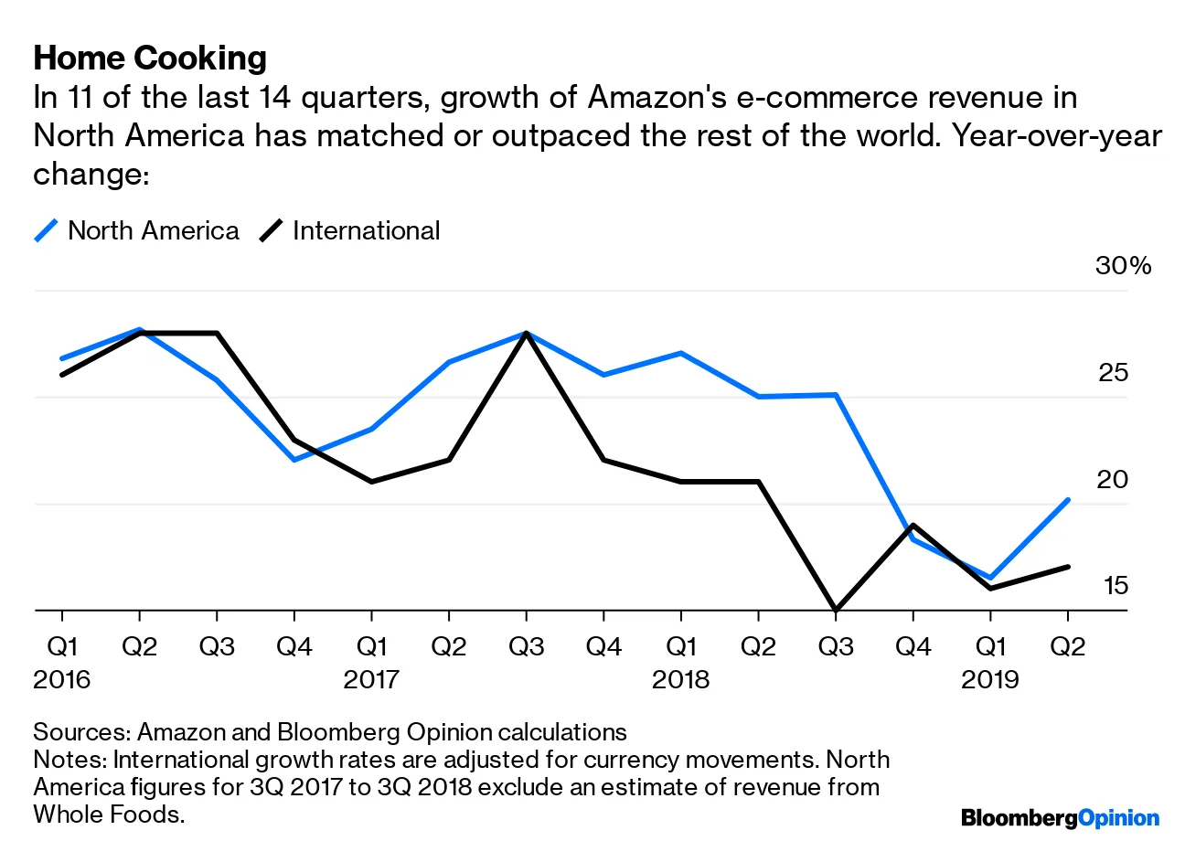 亚马逊公司暗示其缓慢的 国际增长最终会追赶上 其美国增长,但 希拉·奥维德 写道这并不是一定的事情。