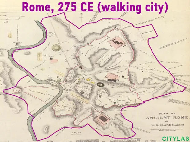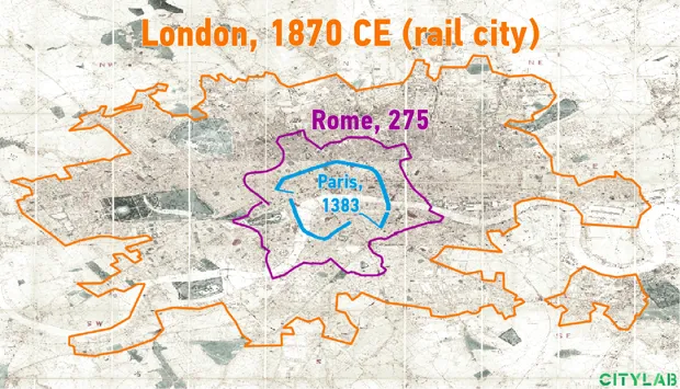 随着交通变得更快,城市变得更大:古罗马、中世纪巴黎、维多利亚时代伦敦、20世纪初的芝加哥和现代亚特兰大的边界。地图:大卫·蒙哥马利/城市实验室