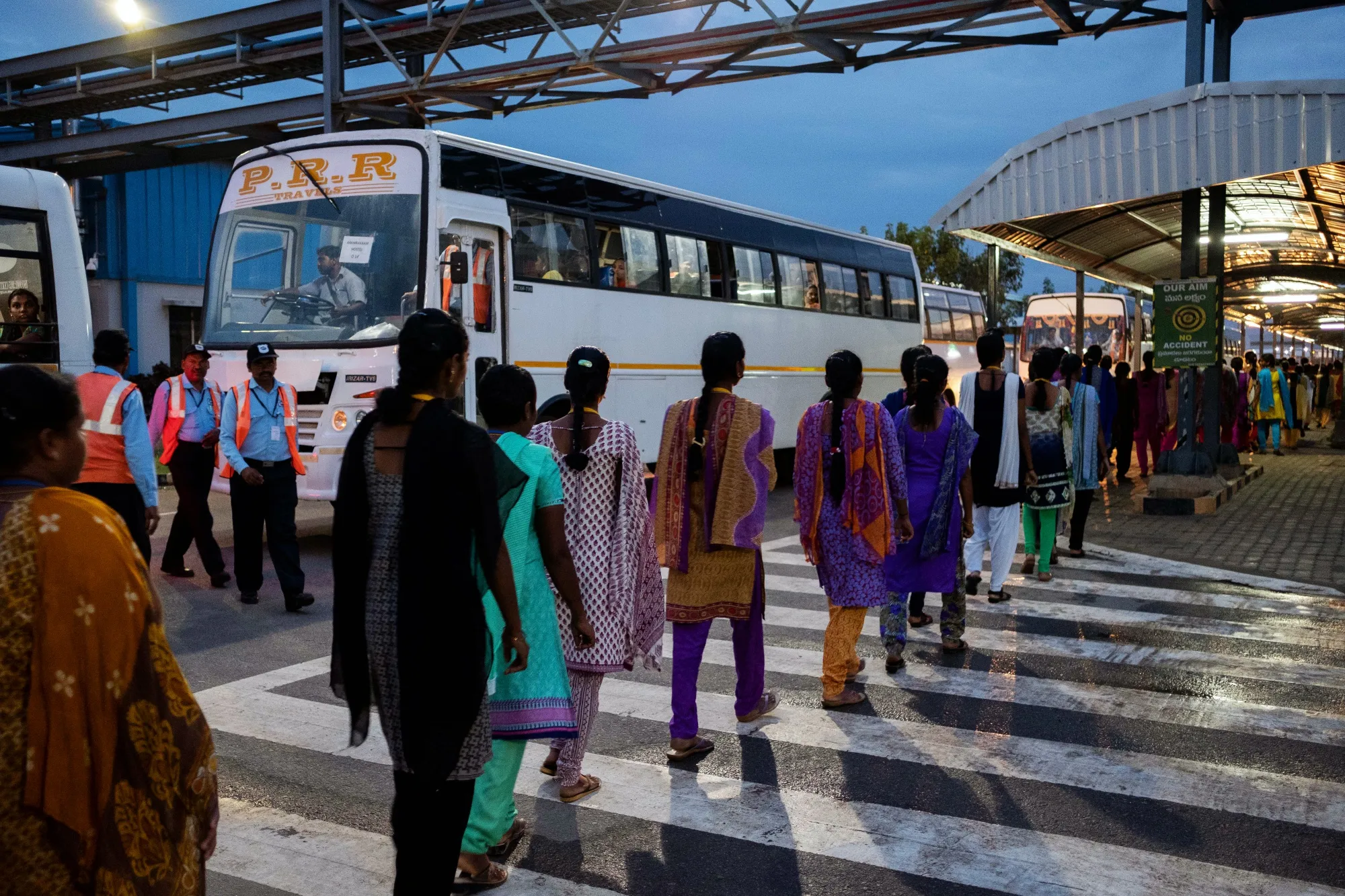 摄影师:Karen Dias/Bloomberg在一个闷热的夏季早晨,数十辆公交车停在南印度安得拉邦一片低矮蓝色建筑的外面。穿着色彩斑斓的沙尔瓦尔卡米兹的女性们下车,她们的杜帕塔围巾在微风中飘动,穿过木槿灌木和宣称“我们的目标,无事故”的海报。