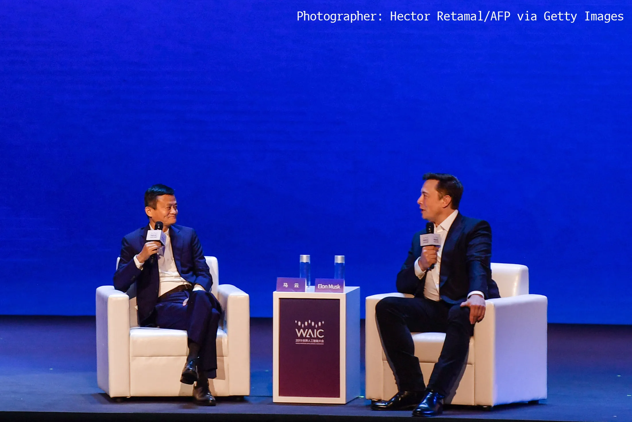 埃隆·马斯克(右),特斯拉的联合创始人兼首席执行官,以及马云,联合国数字合作高级别小组的共同主席,于2019年8月29日在上海的世界人工智能大会(WAIC)上发言。(照片由HECTOR RETAMAL / AFP提供)(照片版权应注明HECTOR RETAMAL/AFP/Getty Images)摄影师:HECTOR RETAMAL/AFP### 我们正在阅读的内容