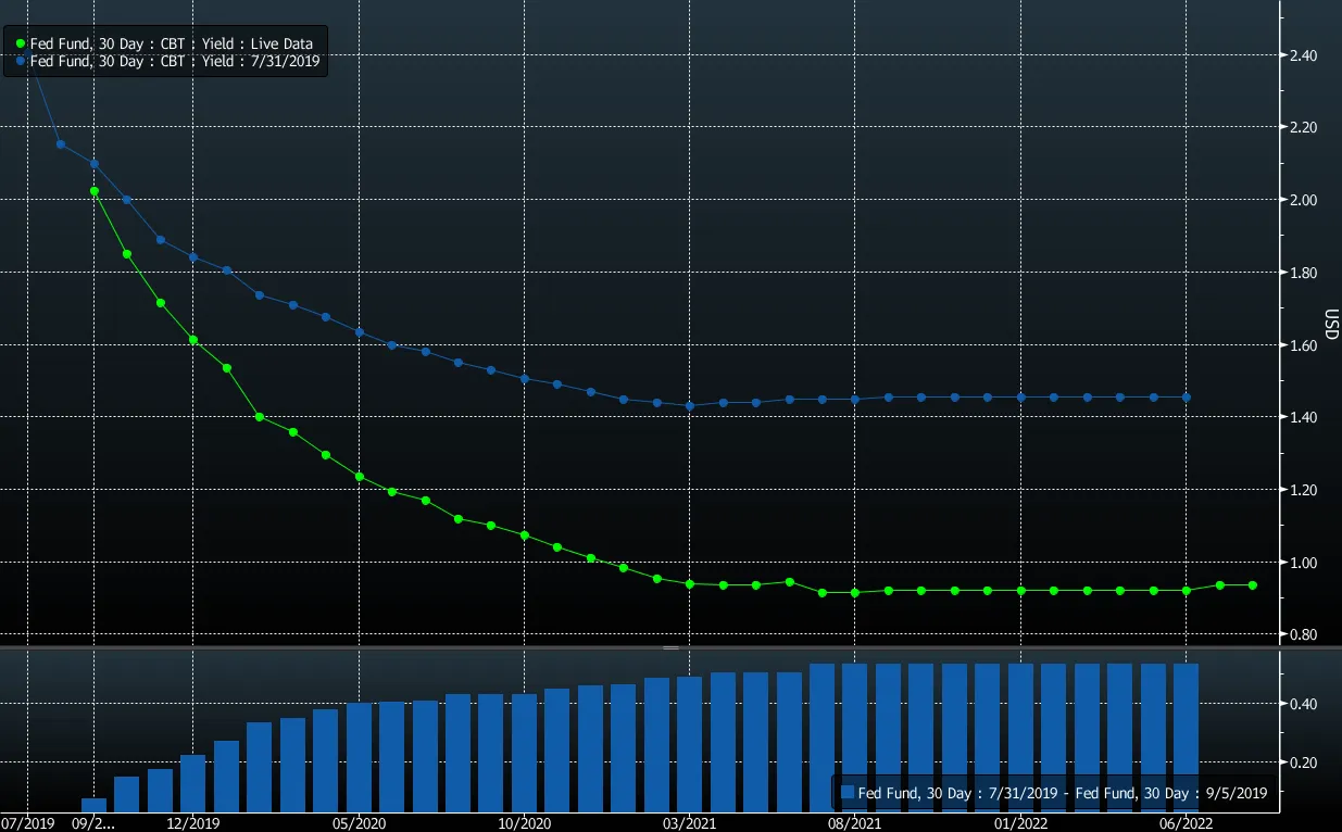 两年期国债收益率在周四飙升。上一次它们有更大的跳跃时,是“好消息是坏消息”——7月初强劲的美国就业报告促使投资者抛售股票,押注美联储不太可能采取刺激措施。最近股票和收益率同步飙升的价格走势显示了剧本的翻转程度。美联储不一定是风险资产的主要驱动因素,一切都与减少尾部风险结果有关:潜在美国经济衰退的接近程度和严重性。回到6月,这来自美联储主席杰罗姆·鲍威尔的保证,即中央银行将采取适当措施维持经济扩张。现在,这来自于对唐纳德·特朗普总统将采取适当措施通过降低贸易战来维持经济扩张的希望,以及基于最近数据的迹象表明这种衰退并不迫在眉睫。请原谅这个老生常谈,但这种动态使投资者处于非常依赖数据的状态。像非农就业报告这样的事件将变得越来越重要,以验证和强化这些预期。自7月31日降息以来,联邦基金期货曲线的向下缺口表明市场继续要求中期内超出“中期调整”的东西。但在短期内,预期与可能结果相当一致,风险资产即使在隐含的美联储放松减弱的情况下也能够上涨。换句话说,只要经济数据没有响起衰退的警报,投资者似乎能够逐渐摆脱货币支持。但请注意:这个过程——就像混乱中断的债券牛市——可能不是单向的,即使最终会发生。