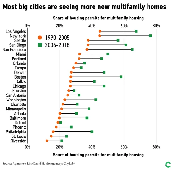 例如,在纽约市大都会地区,从2006年到2018年,超过四分之三的新单位许可都是多户建筑;在旧金山,大约65%。