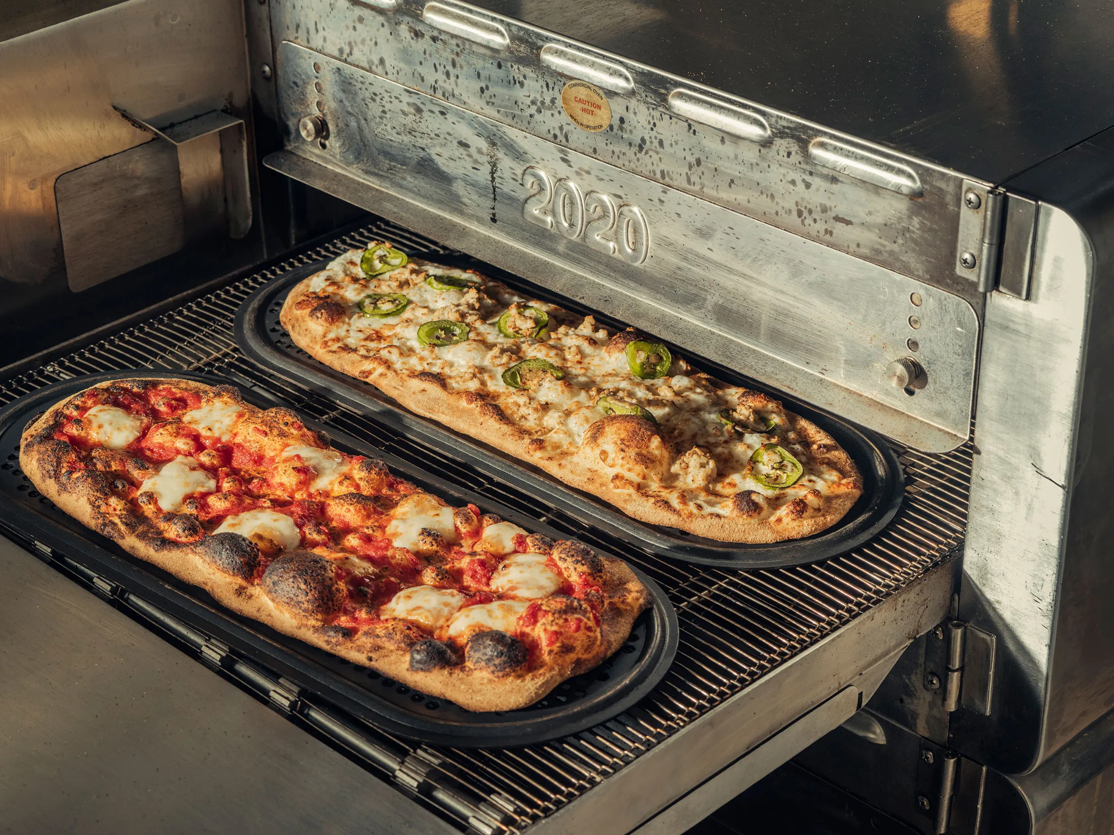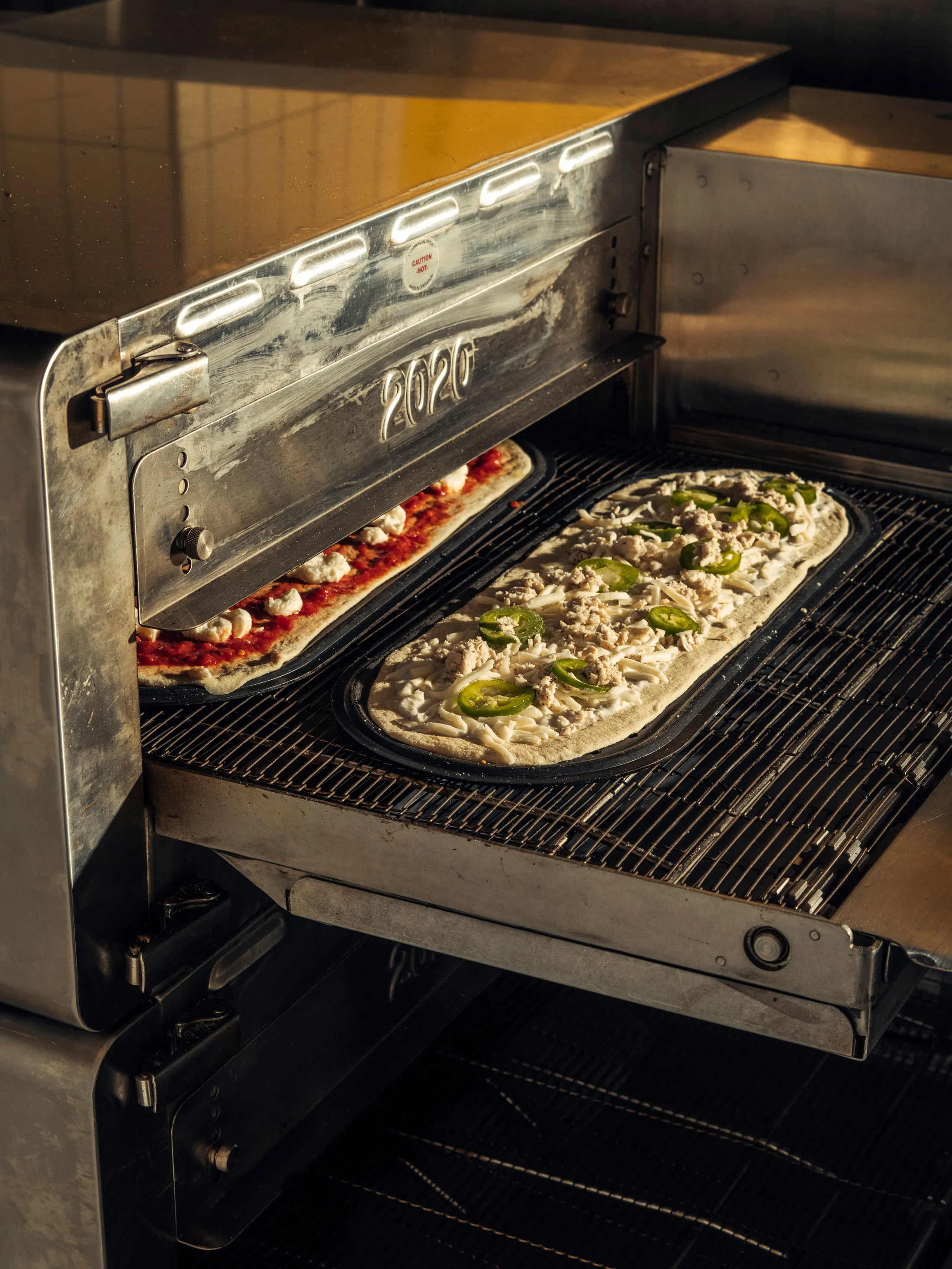 拉斯托里亚说,他所需要的只是电、水和300平方英尺的空间来开设一家店。他坚称,木石炉或马拉福尼炉与他的传送带烤箱对成品的影响微乎其微。“我的厨师朋友们喜欢这些东西,”他说。(在我与的比萨师傅交谈中,普遍观点是,豪华烤箱可以改善比萨的质地,但不能改善风味。&Pizza的烤箱在600华氏度下烹饪,产生的外壳比在800华氏度以上烘烤的外壳稍微密实和紧致。)