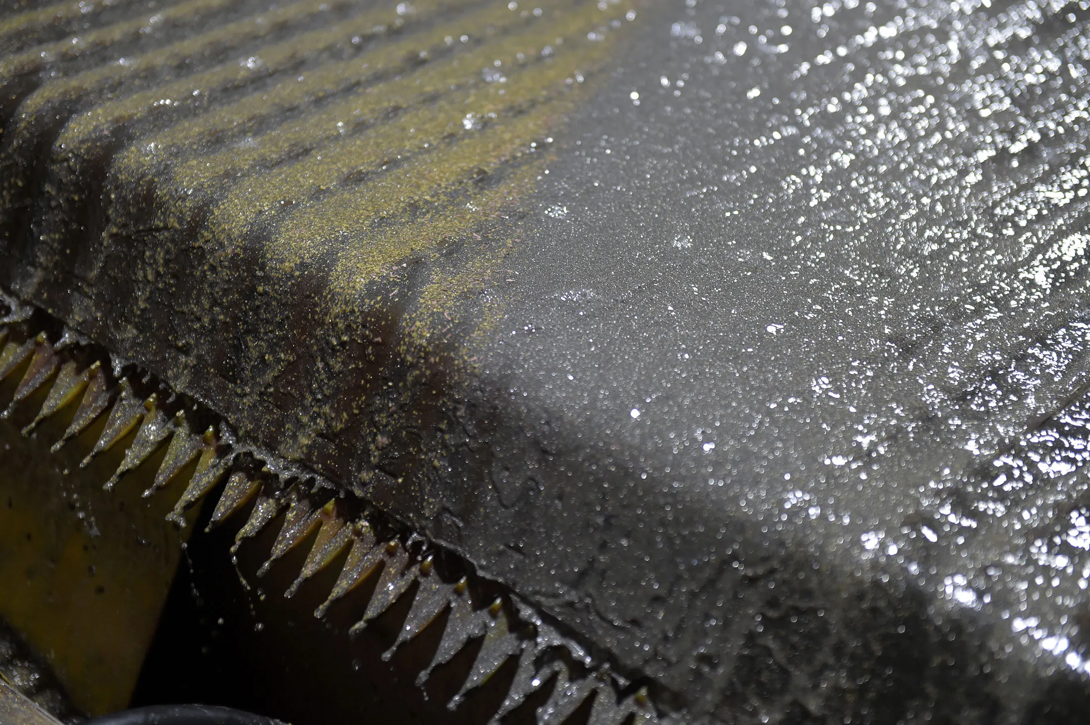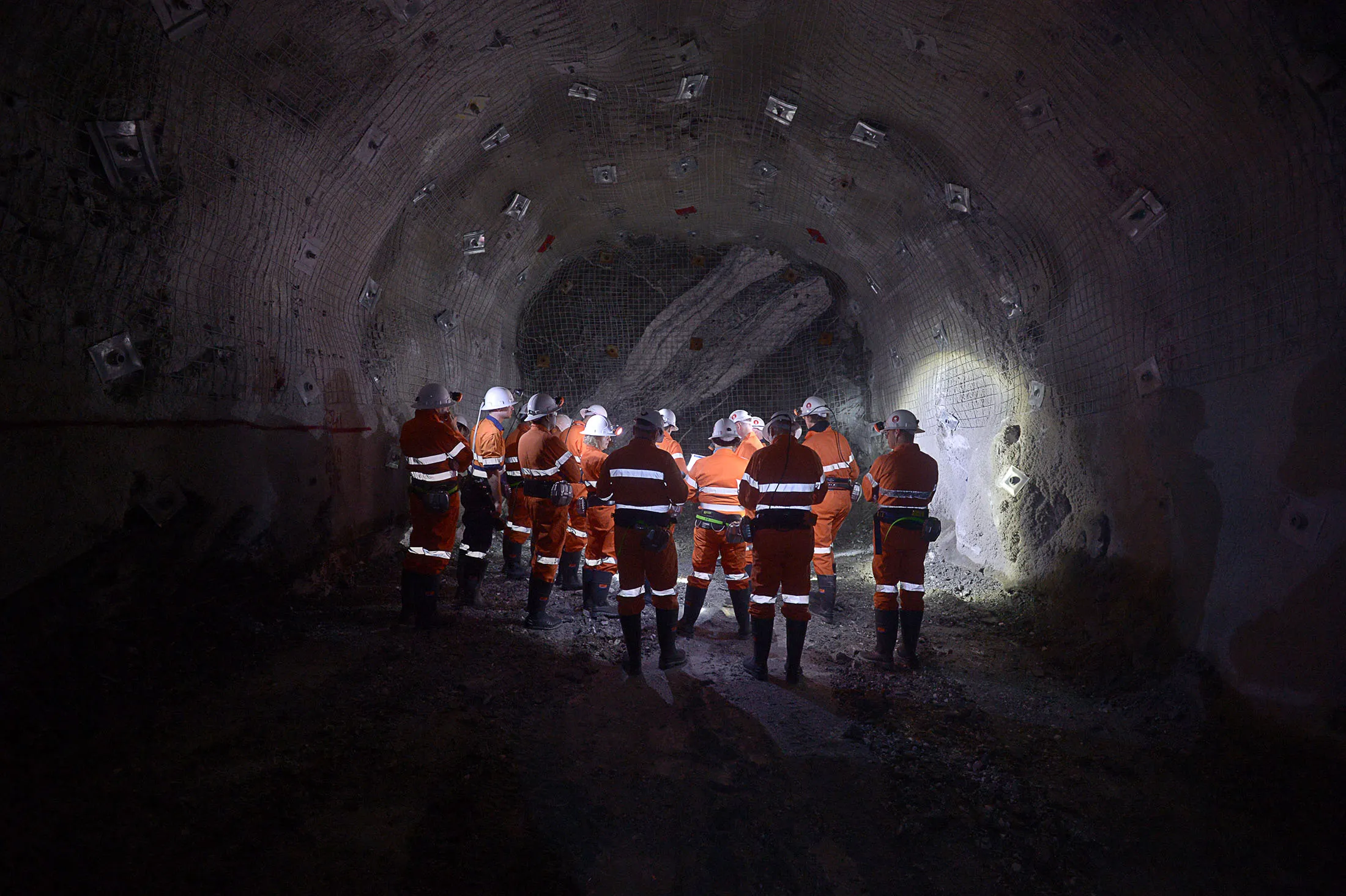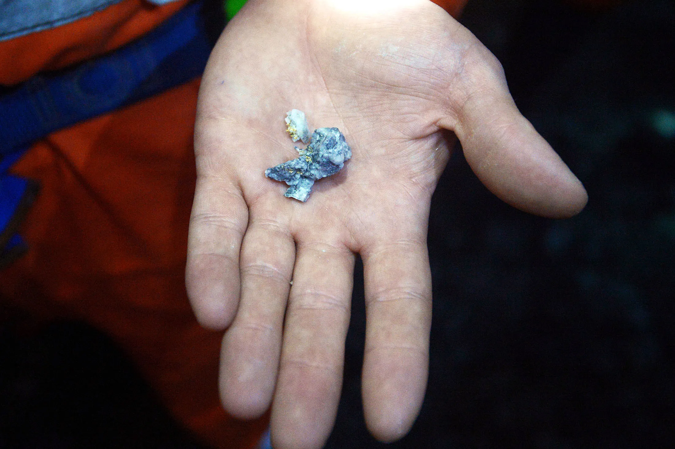在距离地表约1.2公里(0.75英里)的隧道一段中,一条厚厚的对角白色金矿石脉穿过深灰色岩石的面,地面上散落的矿石碎片上镶嵌着可见的闪闪发光的金属颗粒。