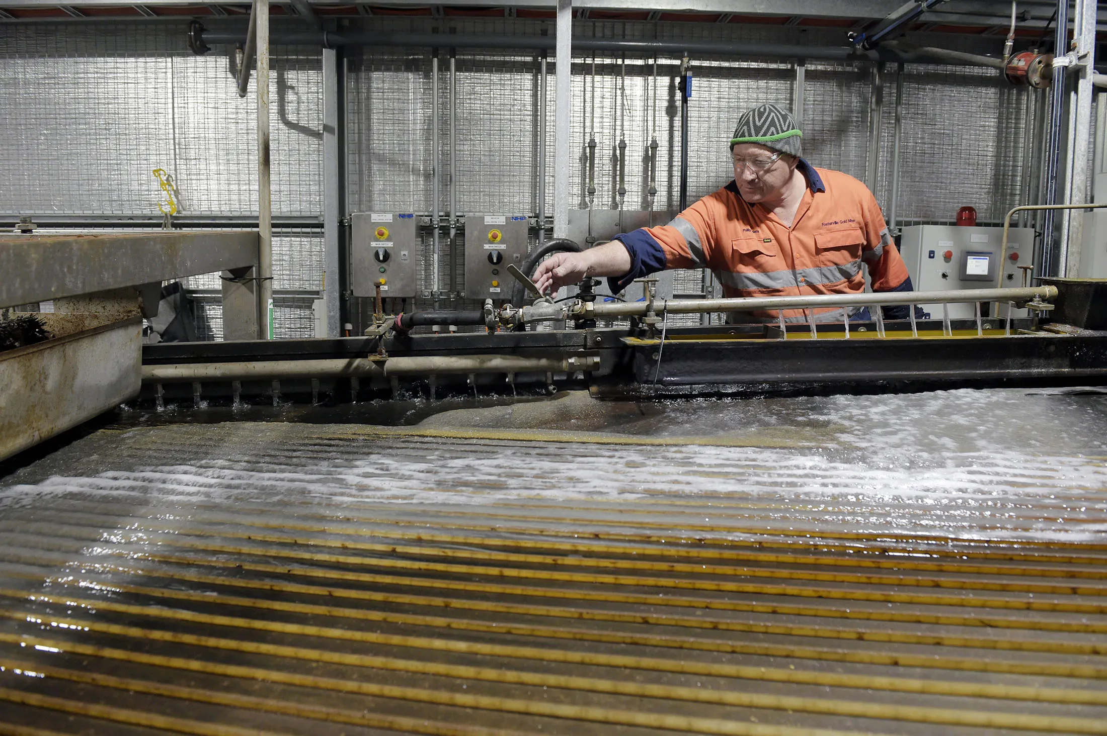 黄金在加工室的重力台上与矿石分离。摄影师:Carla Gottgens/Bloomberg