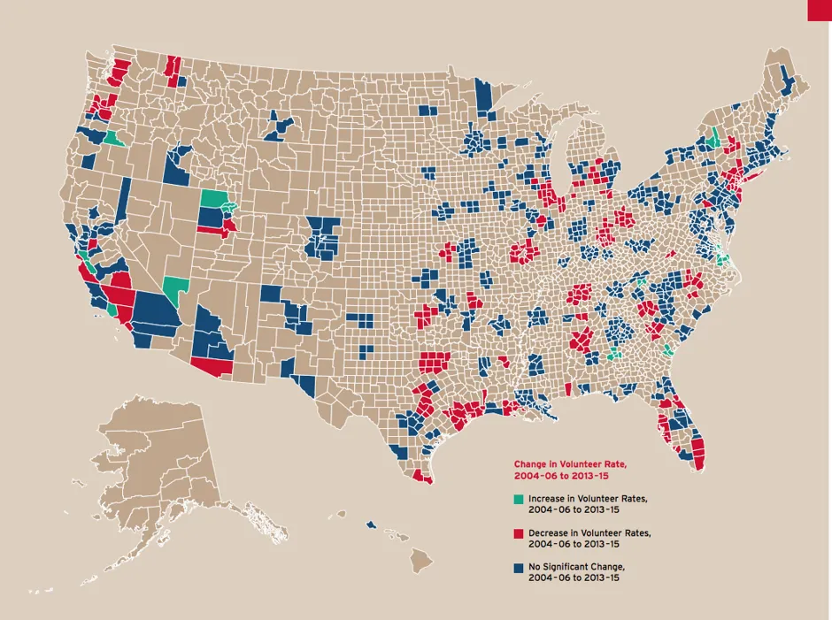 在志愿者比例下降的城市地区,较低的房屋拥有率和较高的经济困境水平是一个共同主题。“你可以想象,如果你在一个社区购买房屋,你往往会更扎根于那里,并长期居住,”他说。“历史上,这种行为使人们更积极参与。”