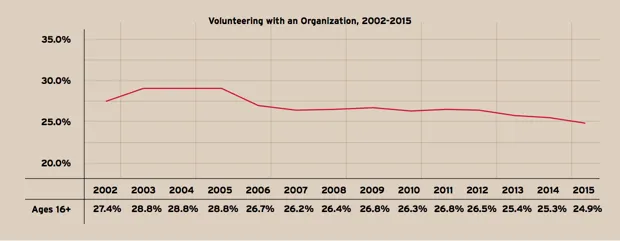 但根据报告,今天,定期自愿奉献时间和金钱的美国人越来越少。自2005年以来,国家志愿者率未超过28.8%,而在2015年,降至最低点,只有24.9%。