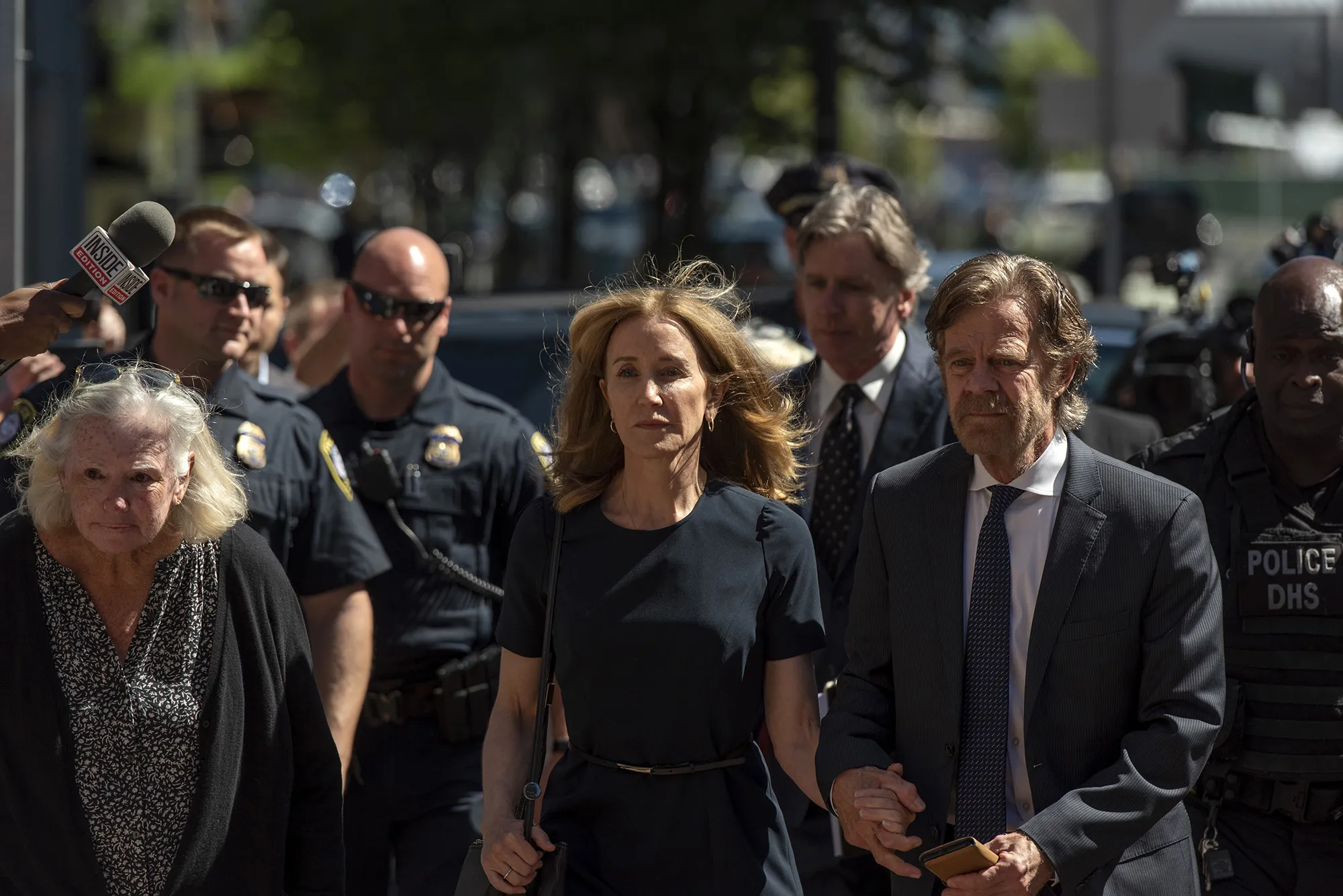 费利西蒂·哈夫曼,中心,2019年9月13日与她的丈夫、演员威廉·H·梅西一起抵达波士顿的联邦法院。摄影师:凯特·弗洛克/彭博社费利西蒂·哈夫曼,中心,和她的丈夫、演员威廉·H·梅西一起抵达联邦法院。摄影师:凯特·弗洛克/彭博社