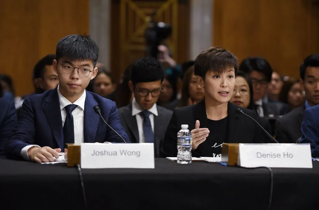香港“民主思路”党秘书长、雨伞运动领袖黄之锋和民主活动家、粤语流行歌手何韵诗于2019年9月17日在华盛顿国会山向国会-行政委员会就香港的民主运动作证。(照片由Olivier Douliery / AFP提供)(照片版权应注明OLIVIER DOULIERY/AFP/Getty Images)法新社### 香港人前往华盛顿