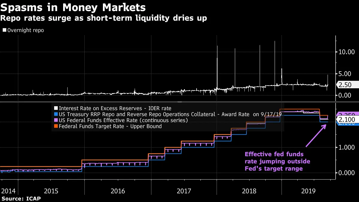 如果你想了解市场专业人士在谈论什么,查看彭博社的<阅读>功能是个不错的选择。周二,五个最受关注的故事中至少有三个是关于货币市场的混乱。这是在我们看到回购利率——以美国国债等“安全”抵押品借入隔夜资金的成本——飙升至10%之后。纽约联邦储备银行因此进行了紧急流动性注入,成功将回购利率降回2.5%。