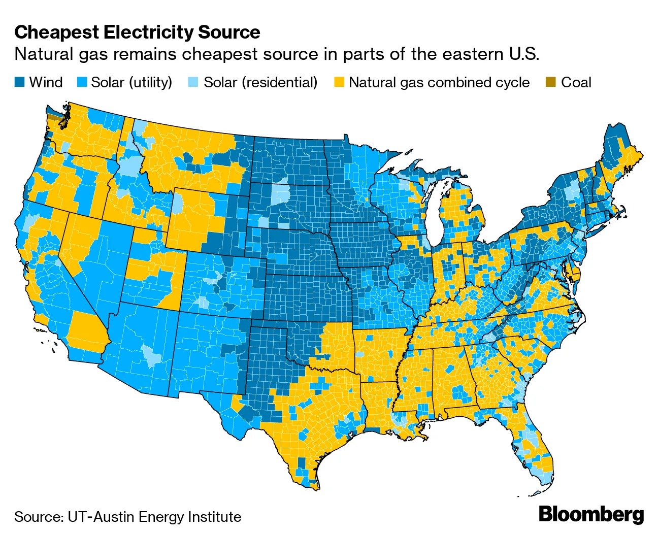 但还有这个经济现实:PJM穿越美国的一部分,这里拥有世界上最丰富的天然气储备。尽管风能和太阳能的成本下降得很快,但在这些地方,天然气的价格更便宜。