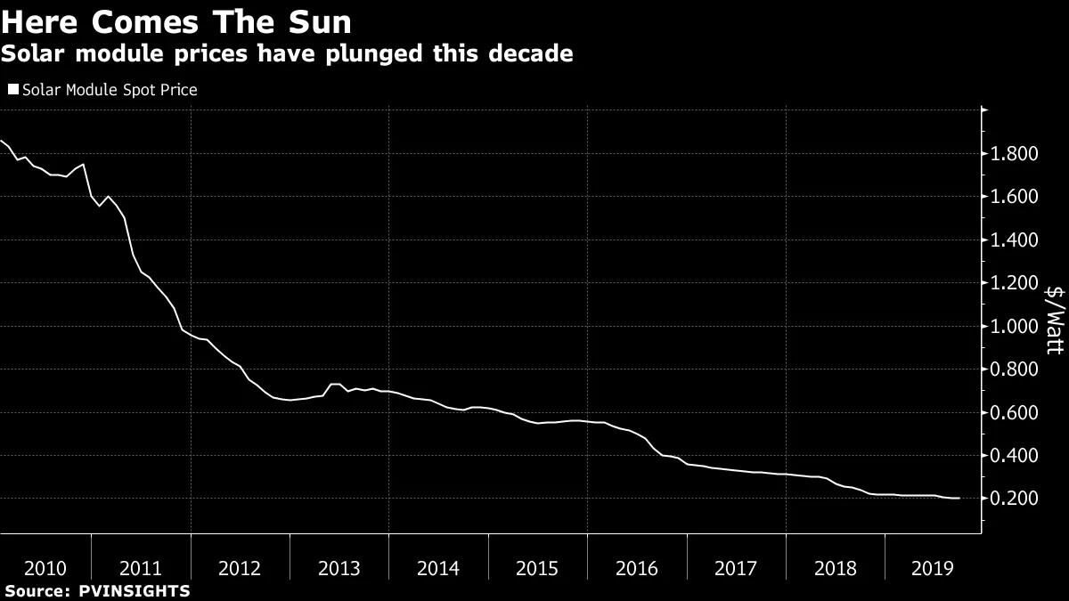 “太阳能变便宜了,”彭博新能源财经的分析师珍妮·蔡斯说。“就是这么简单。”