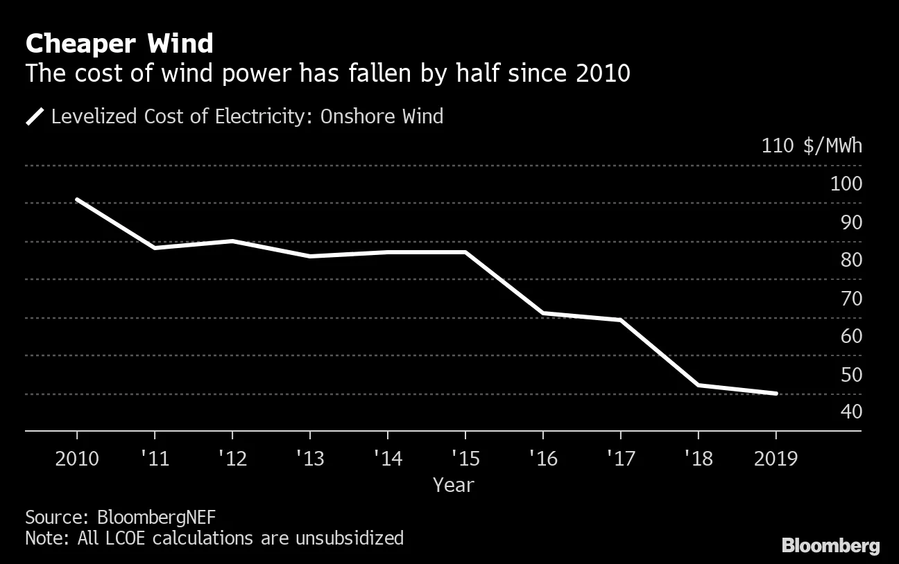 简而言之,原因在于补贴有效。经过数十年的配额、税收减免和上网电价,风能和太阳能的部署已经足够广泛,使制造商和开发商变得越来越高效,从而降低成本。自2010年以来,风电成本下降了约50%。太阳能下降了85%。根据彭博新能源财经的数据,这使得它们在世界三分之二的地区比新的煤炭和天然气发电厂更便宜。