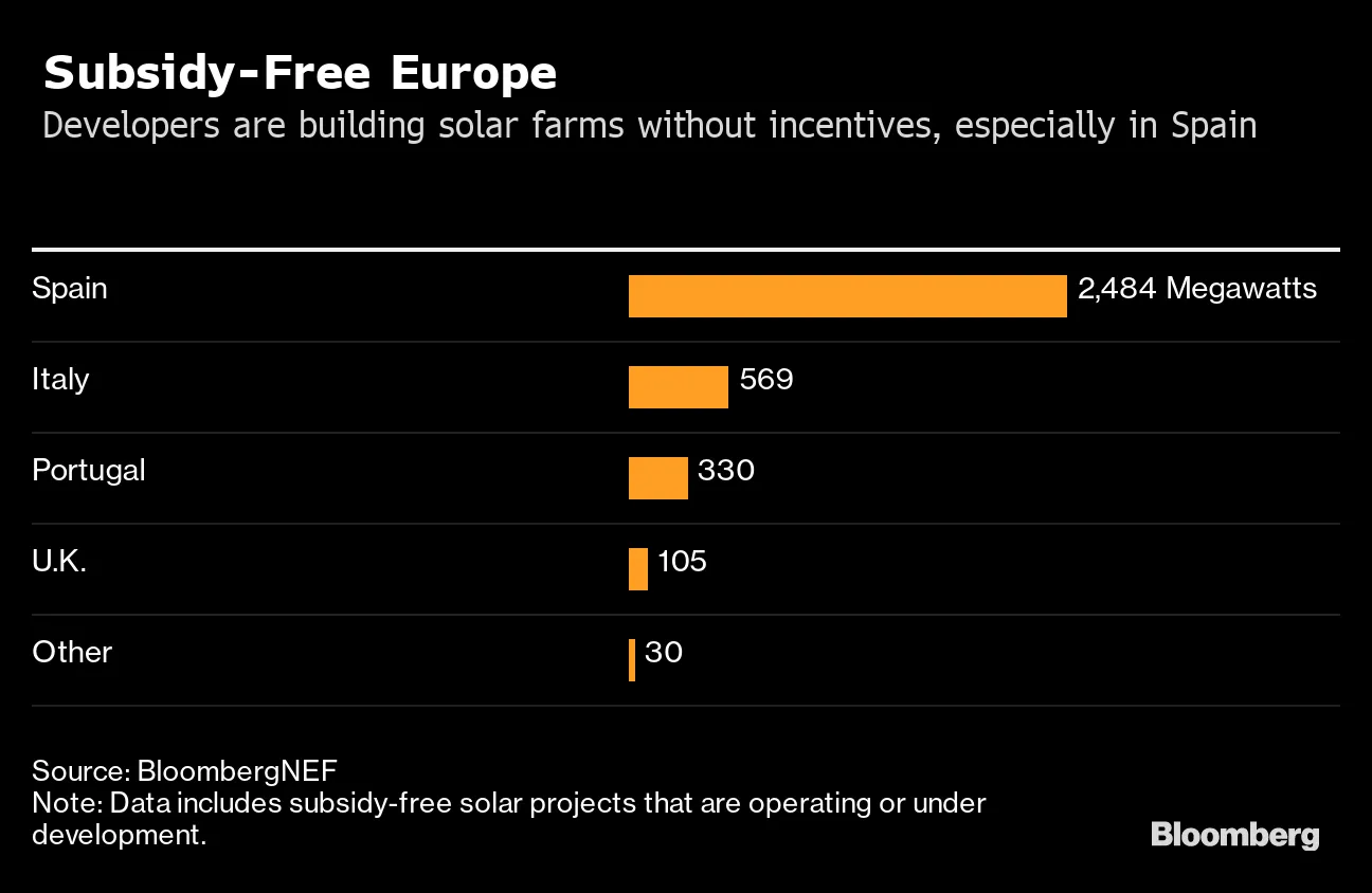 或许在南欧干旱的广袤土地上,推动无补贴清洁能源的趋势最为明显。仅在2019年,西班牙、意大利、葡萄牙等地预计将有约750兆瓦的无补贴清洁能源项目接入电网——足以为约333,000户家庭供电,BNEF的分析师皮耶特罗·拉多亚表示。