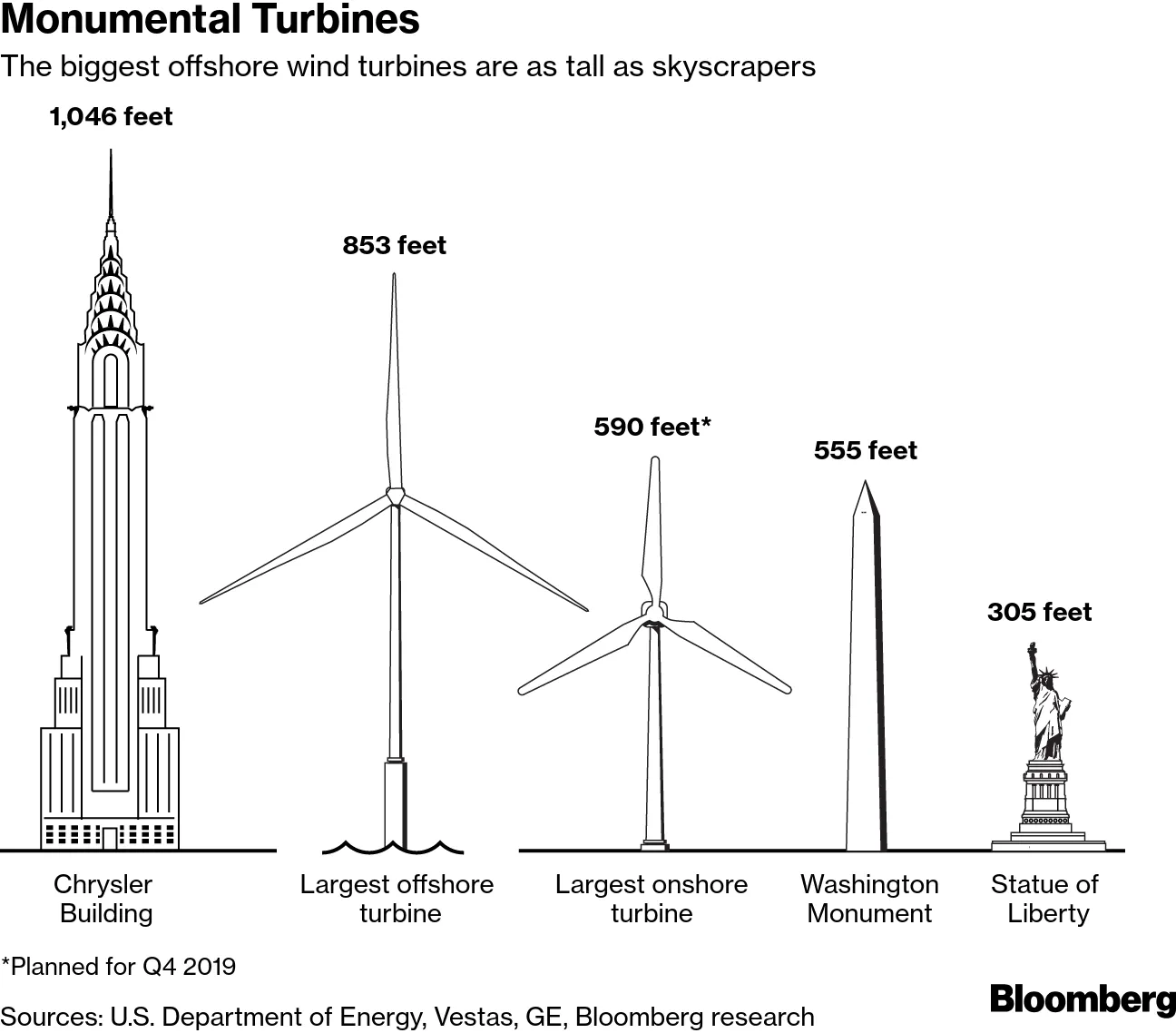 奥斯特德将使用最强大的风力涡轮机,用于美国海岸的项目。这家丹麦公司将为其计划于2022年完成的马里兰州Skipjack项目使用通用电气的12兆瓦Haliade-X涡轮机,并为一个1100兆瓦的项目提供服务,该项目将在2024年开始为50万户家庭供电。这些853英尺(260米)高的涡轮机与摩天大楼一样高。