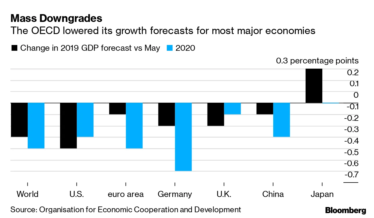 经济合作与发展组织成为最新 发出全球增长警报的机构。该组织下调了几乎所有在四个月前做出的预测,因为美中贸易战加剧了经济可能陷入停滞的担忧。“各国政府绝对应该利用低利率现在投资未来,以便这种 低迷增长 不会成为新常态,”首席经济学家劳伦斯·布恩表示。经济合作与发展组织对英国发出了特别 严峻的警告。
