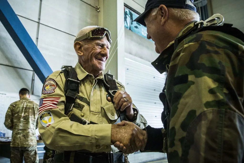美国二战老兵汤姆·赖斯(左),98岁,来自加利福尼亚州,在2019年9月19日于埃因霍温空军基地跳伞前与美国大使皮特·霍克斯特拉(右)握手。- 赖斯是101空降师的老兵,与阿纳姆市市长艾哈迈德·马尔库赫和三位大使计划在“市场花园行动”75周年之际跳伞并降落在阿纳姆。(照片由文森特·扬宁克/ ANP / AFP提供)/ 荷兰禁止使用(照片版权应注明文森特·扬宁克/ AFP/ Getty Images)法新社**1. 一位98岁的诺曼底老兵在飞机上经历了一次“愉快的坠落”。**汤姆·赖斯跳伞降落在荷兰土地上,以纪念“市场花园行动”75周年——他不会停止跳伞直到他满100岁。