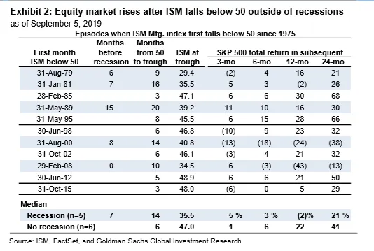 如果是这样(保尔森上面的数据给出了我们可能避免衰退的理由),那么高盛集团已经进行了数据分析,显示在制造业ISM出现假阳性时购买股票通常会非常成功。例如,2012年ISM跌破50后,标准普尔500指数在接下来的两年中上涨了惊人的50%: