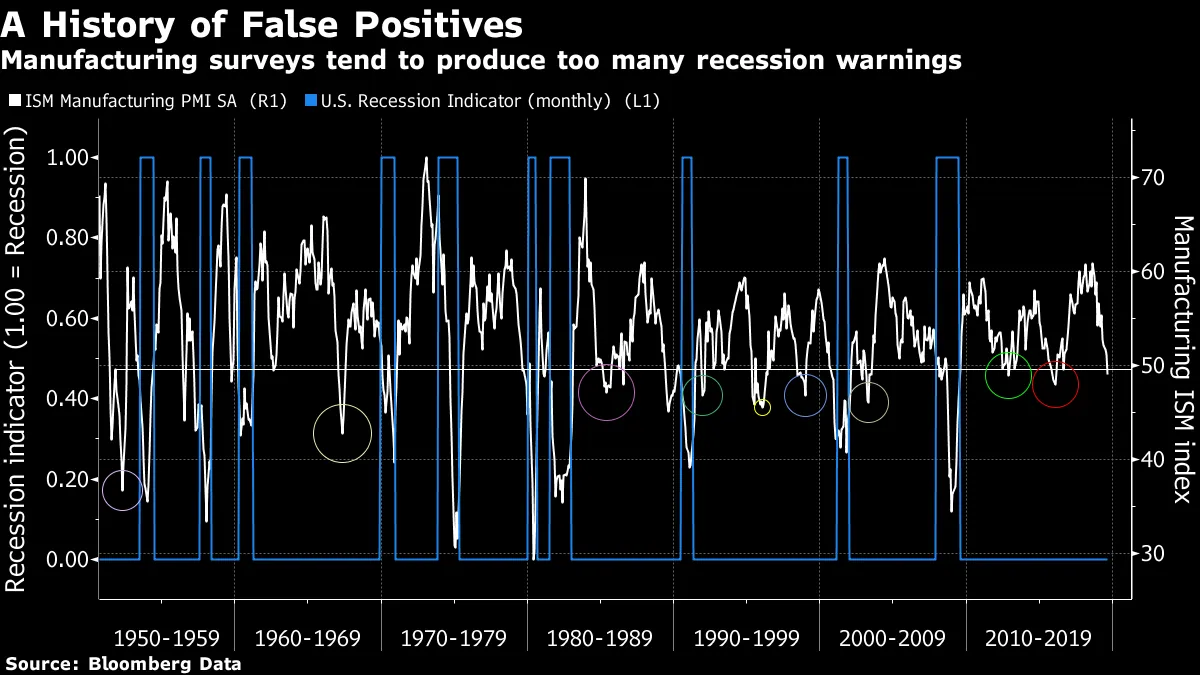 此外,在错误的衰退指标之后盈利的历史非常有希望。制造业ISM,采购经理人调查,是经济的一个很好的方向性指标。但它的设定是,任何低于50的数字都表示衰退或收缩。基于这一点,它是有缺陷的。曾经有许多“假阳性”低于50的读数没有随之而来的美国衰退,包括在当前扩张期间的两个。因此,九月份的49.9数字很可能是一个错误的指标: