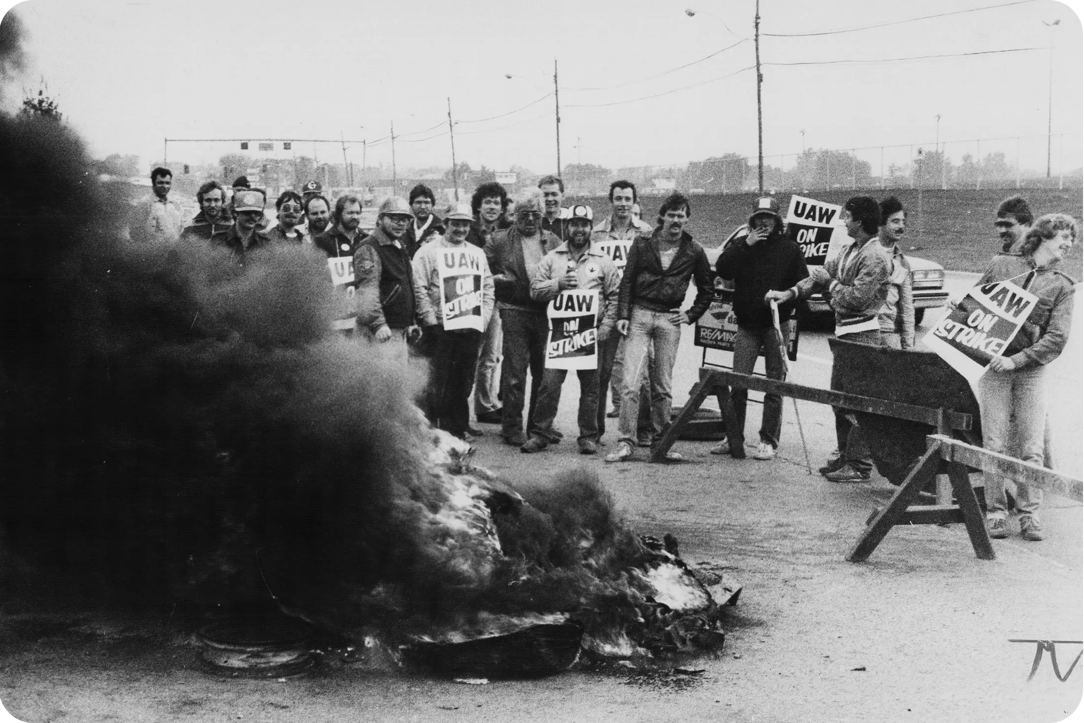 加拿大汽车工人在1984年10月17日于安大略省奥沙瓦的通用汽车公司进行抗议。这些顽强的奥沙瓦工人在美国汽车工人联合会中午截止日期之前就离开了工作岗位,率先发起罢工。摄影师:阿尔·邓洛普/多伦多星报**1985-86:**加拿大UAW分支因对通用汽车、福特和克莱斯勒的让步感到愤怒而脱离母工会。UAW撤回了在本田俄亥俄州工厂进行工会投票的国家劳动关系申请。