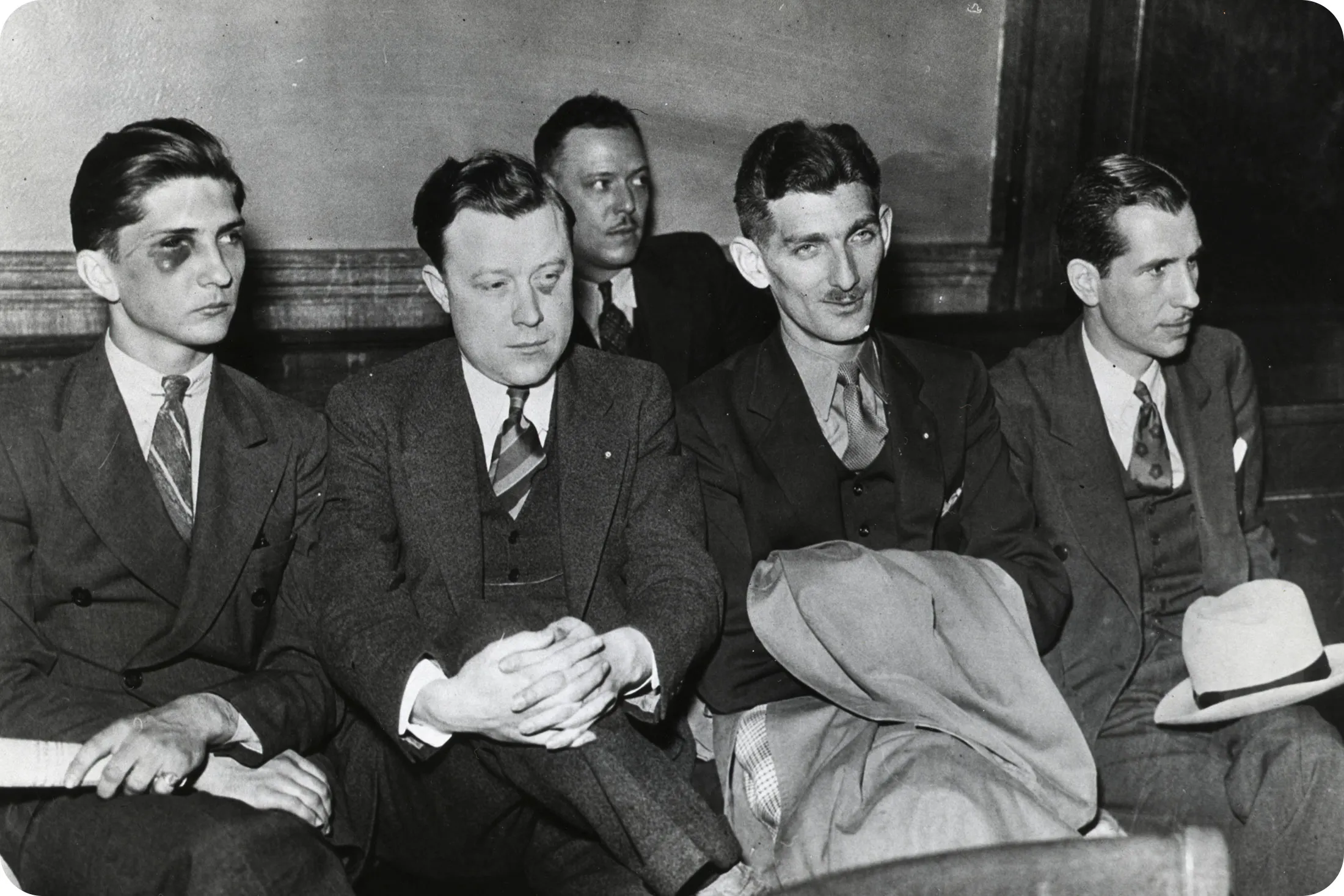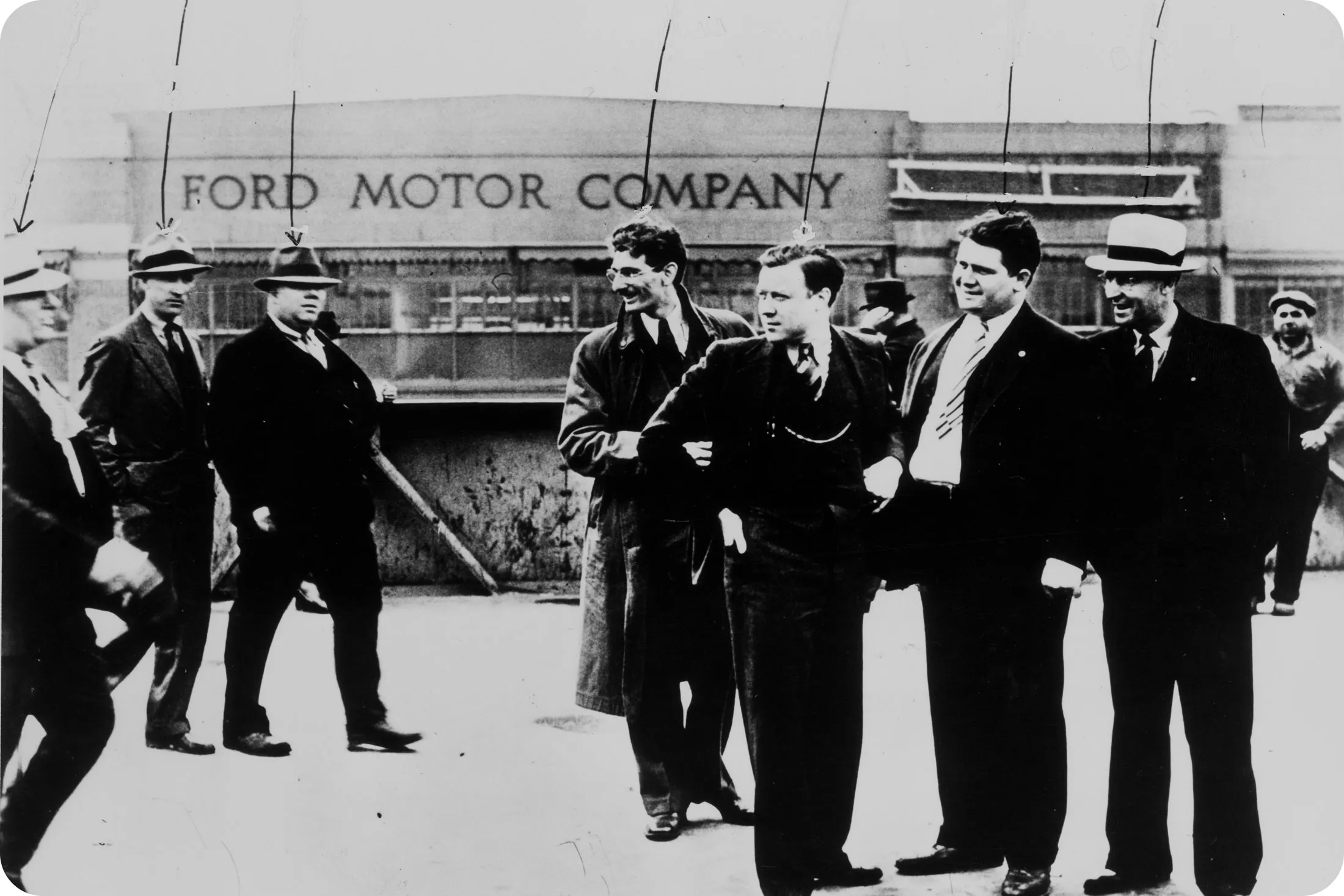 (从左,前景)阿尔文·斯蒂克尔、沃尔特·鲁瑟、罗伯特·坎特和罗伯特·森特曼于1937年6月2日出庭作证,调查一周前福特工厂的暴力事件。摄影师:贝特曼档案1937年5月: 为了组织福特汽车公司的工人,鲁瑟和其他UAW支持者在通往公司河鲁日综合体的行人天桥上发放传单。福特的保安人员在一次被称为天桥之战的冲突中袭击并殴打他们。一位底特律新闻摄影师偷偷将攻击的照片带过保安,帮助激发对工会的支持,但亨利·福特拒绝承认。