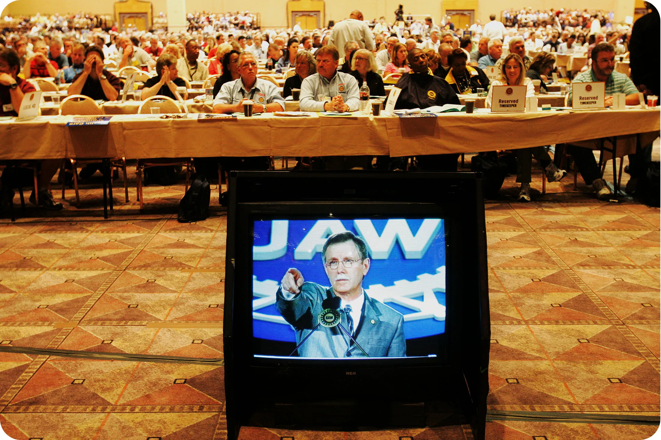 UAW主席罗恩·盖特尔芬格于2006年6月13日在拉斯维加斯的工会大会上通过显示器向代表们发表讲话。摄影师:Jae C. Hong/AP Photo2002: Ron Gettelfinger当选为第九任UAW主席。