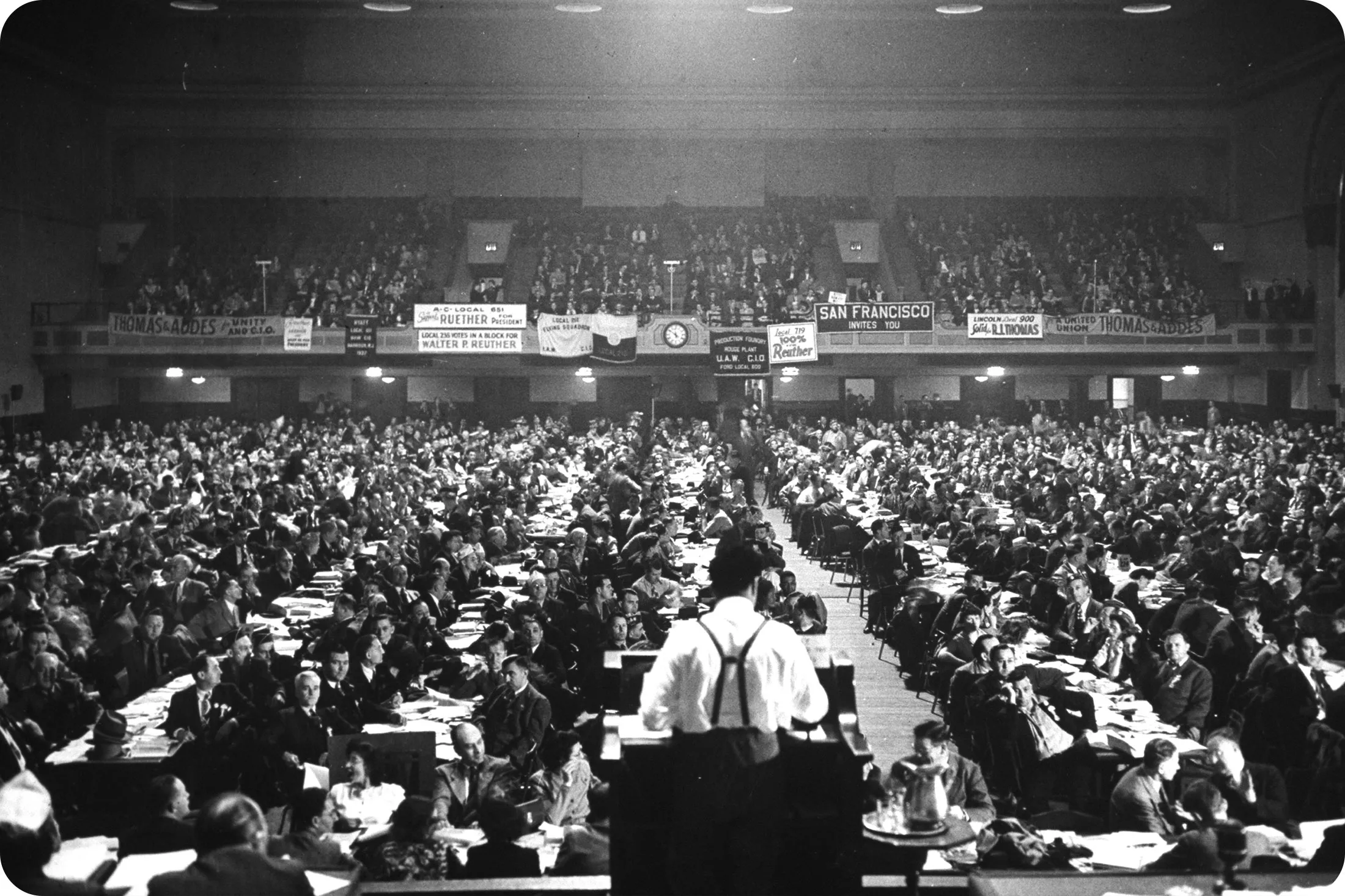美国汽车工人联合会大会于1946年3月在新泽西州大西洋城选举沃尔特·鲁瑟为主席。摄影师:萨姆·谢尔/生活图片收藏1946年: UAW成员选举鲁瑟为工会第四任主席。