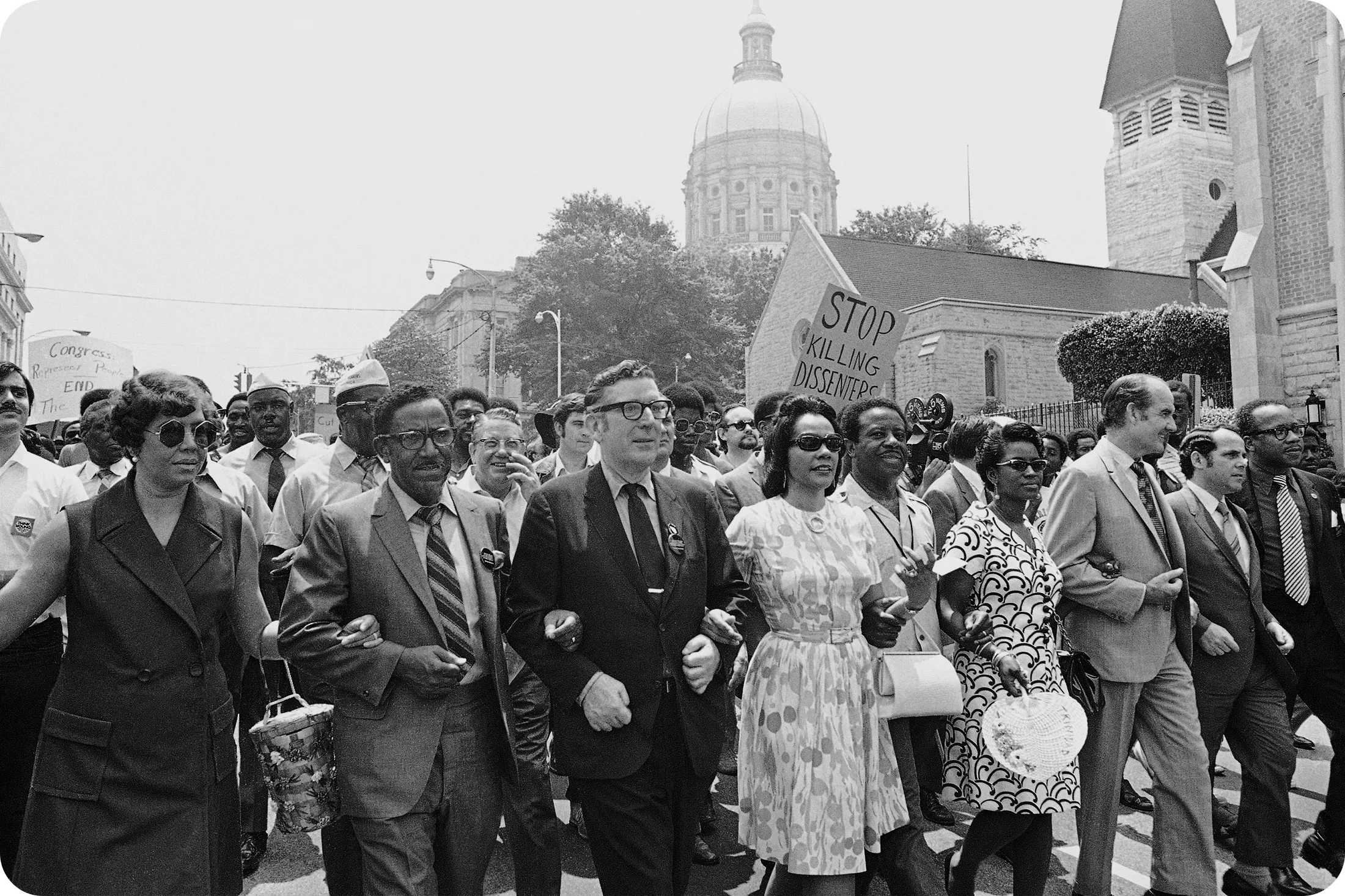 数千名抗议者于1970年5月23日经过亚特兰大的州议会大厦,领头的是(从左,第二位开始)南方基督教领导会议(SCLC)主席J.E. 洛威牧师;新当选的UAW主席伦纳德·伍德科克;被杀害的民权领袖马丁·路德·金的遗孀科雷塔·金;SCLC主席拉尔夫·阿伯纳西牧师;他的妻子;以及南达科他州的民主党参议员乔治·麦戈文。摄影师:美联社照片