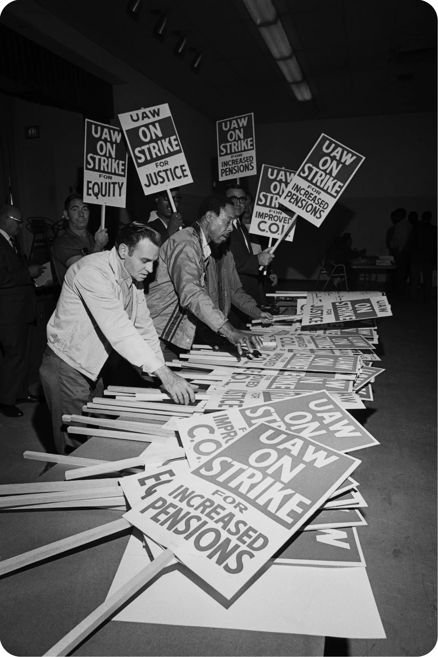 UAW地方22的成员在底特律为即将到来的对通用汽车的罢工准备标语牌,时间是1970年9月14日。摄影师:贝特曼档案**1970年:**鲁瑟于5月9日在飞机坠毁中遇难,伦纳德·伍德科克成为第五任UAW主席。9月,他领导了一场对通用汽车的罢工,持续67天,停止了该汽车制造商所有设施的生产。最终合同包括更高的工资、一项允许工人在工作30年后退休并领取养老金的计划,以及为退休人员支付药物和医疗保险费用。