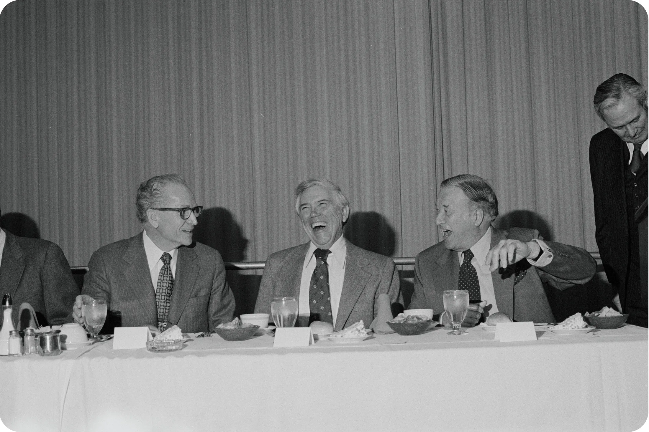道格拉斯·弗雷泽,旁边是福特汽车公司董事长亨利·福特二世(右)和通用汽车董事长托马斯·墨菲(左),在1979年1月29日的底特律经济俱乐部。**1977:**道格拉斯·弗雷泽成为最后一位担任UAW主席的创始人。