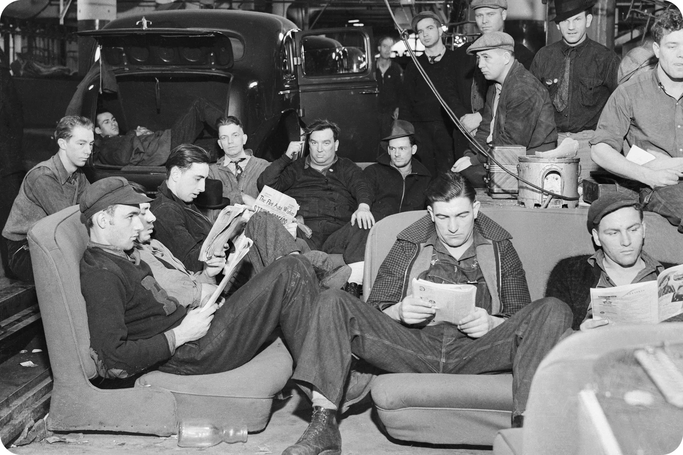 联合汽车工人协会在密歇根州弗林特的通用汽车工厂发起了第一次成功的静坐罢工,始于1936年12月。