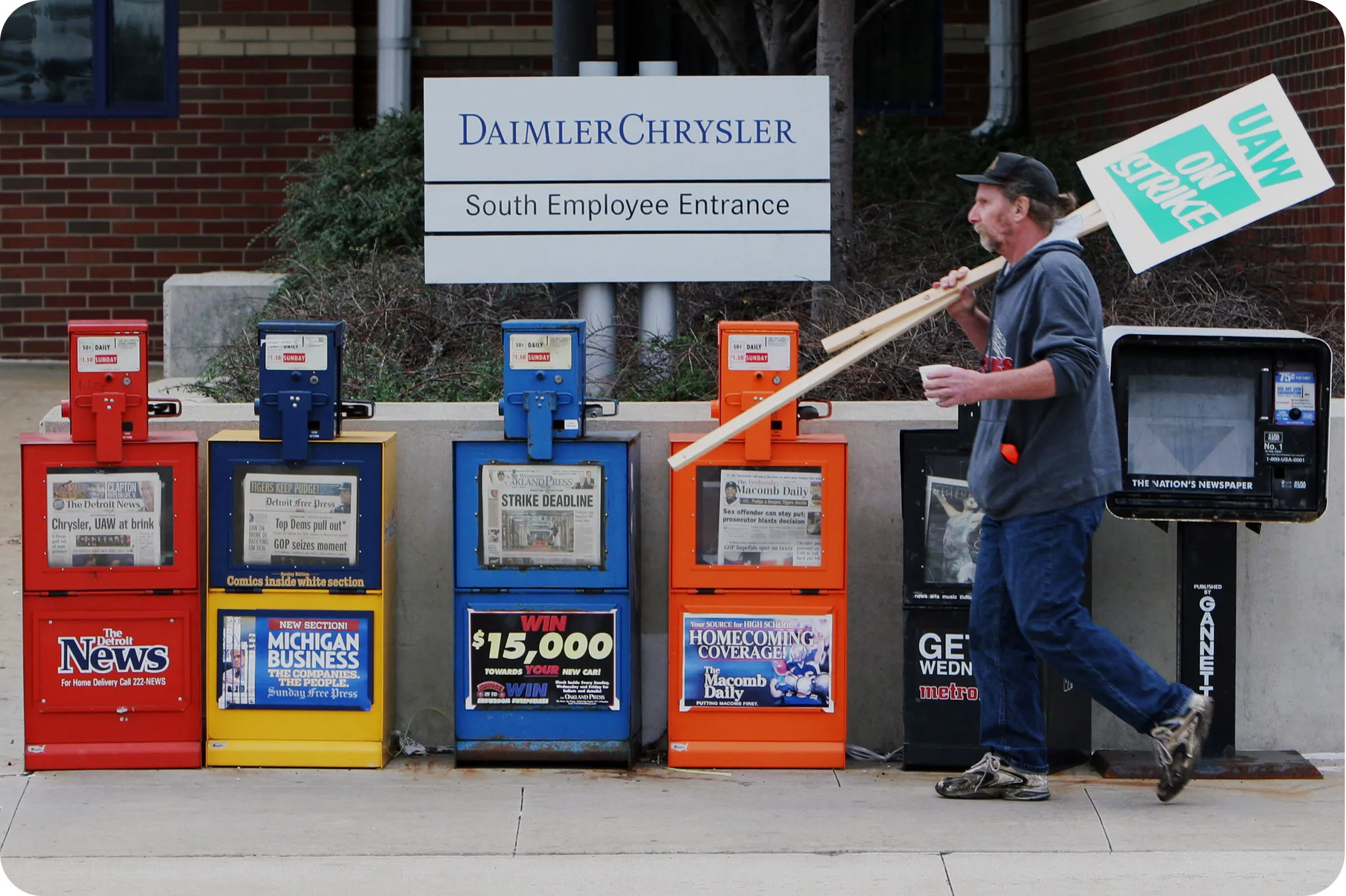 汽车工人霍华德·阿德勒,来自密歇根州皇家橡树,在2007年10月10日经过密歇根州沃伦的克莱斯勒工厂入口,手持抗议标语。摄影师:Fabrizio Costantini/纽约时报2005-11: 行业动荡:大萧条、飙升的汽油价格、汽车销售接近30年来的低点、工厂关闭、裁员、 破产和政府救助 在通用汽车和克莱斯勒,以及 大规模重组 在福特。2007年的合同创建了一个两级工资制度,新员工的工资约为资深员工的一半,并将数十亿美元的退休医疗保健义务从汽车公司转移到工会管理的基金。