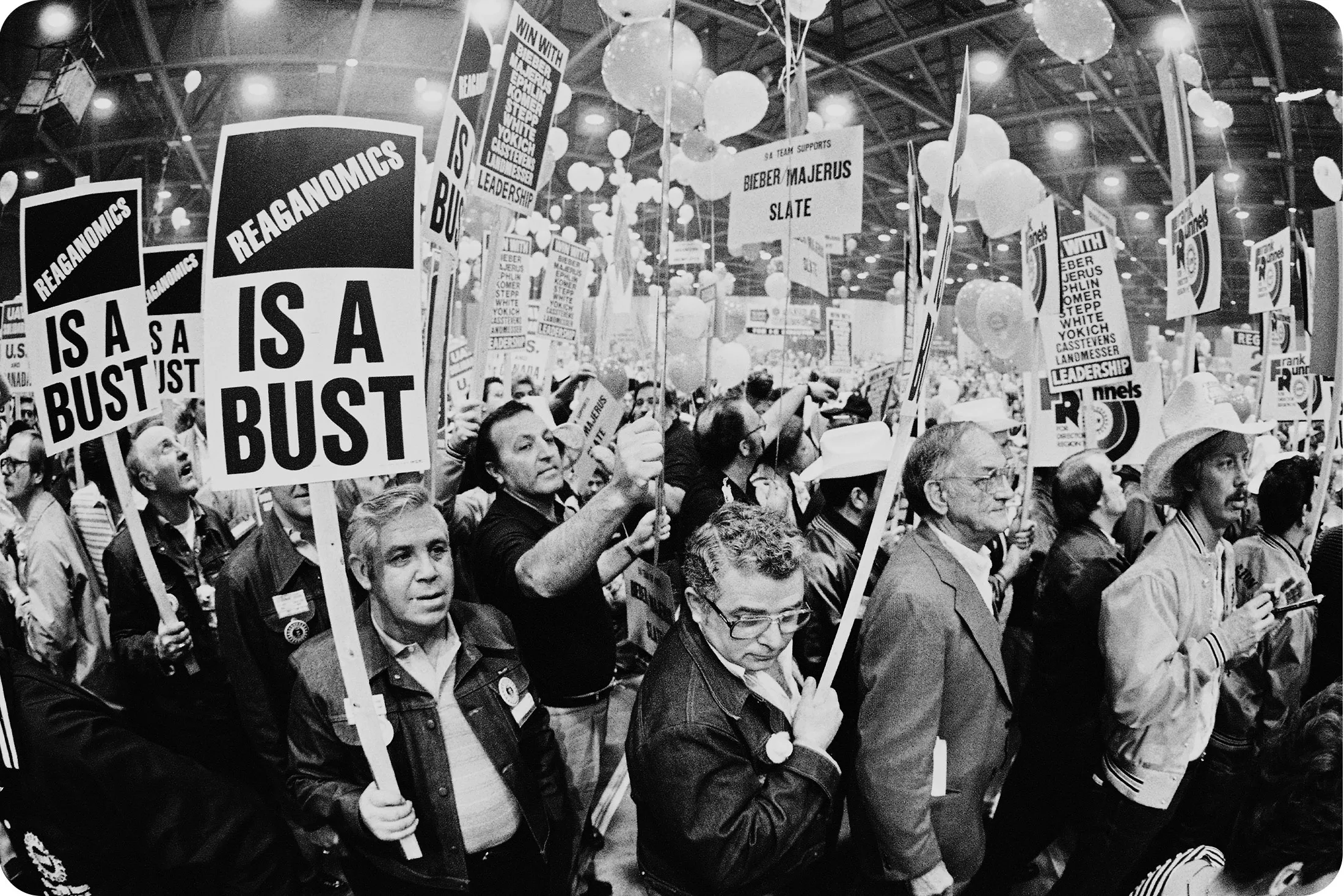 美国汽车工人代表于1983年5月18日在达拉斯的大会现场示威,随后以压倒性票数选举欧文·比伯为主席。摄影师:大卫·布雷斯劳尔/美联社照片**1983年:**欧文·比伯成为第七任UAW主席,并寻求与三大汽车公司更多的劳资合作。