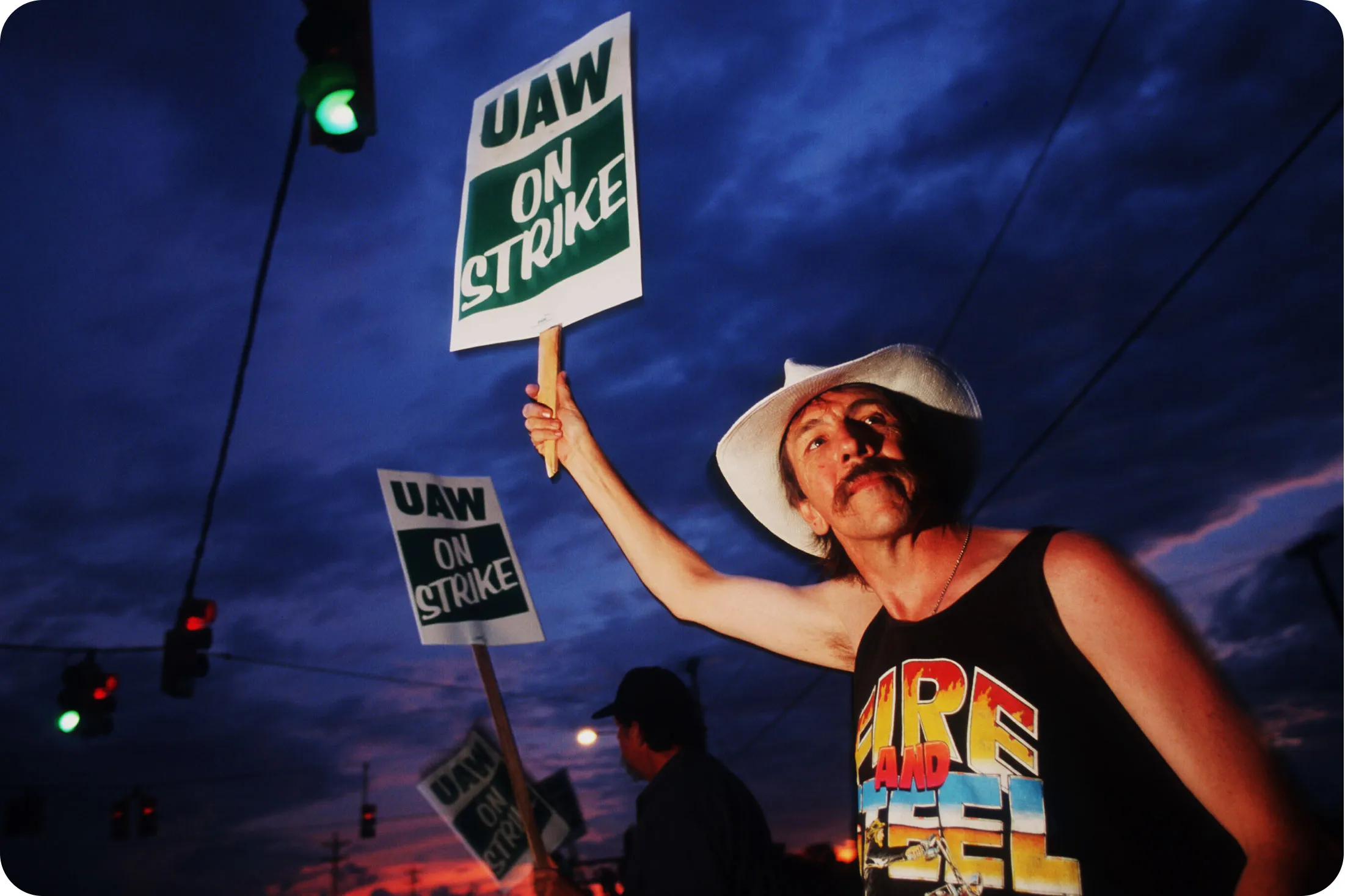 UAW成员于1998年6月29日在密歇根州弗林特的通用汽车零部件供应设施罢工。摄影师:波特·吉福德/联络**1998:**随着汽车行业日益全球化,公司寻求更好地管理零部件库存以控制成本,超过9,000名工人在密歇根州弗林特的通用汽车金属冲压厂和零部件供应设施罢工。这场持续超过50天的停工最终导致整个汽车制造商北美业务的产出停滞,通用汽车在报告第三季度业绩时表示,损失了12亿美元的利润。