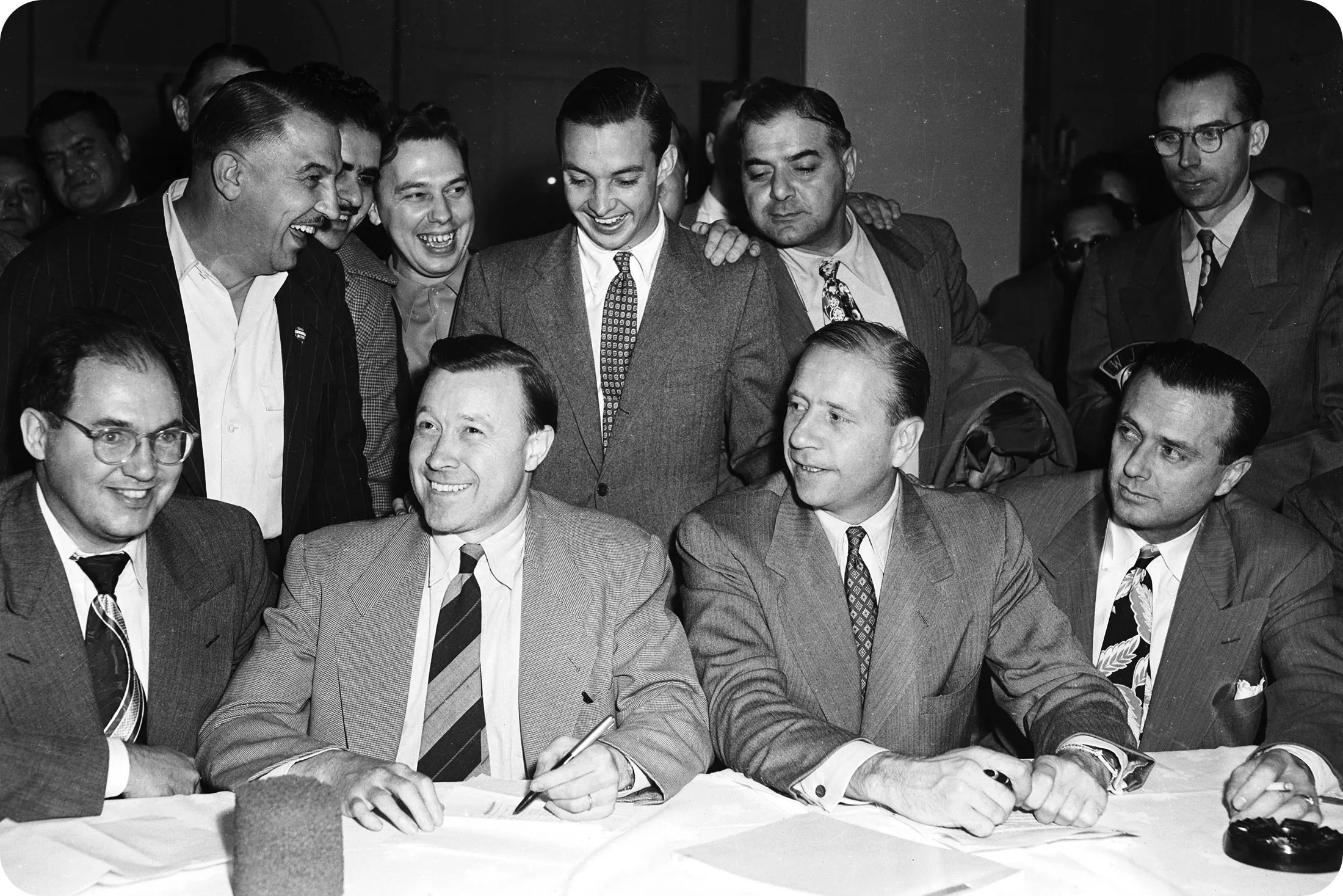在经过119天的谈判后,福特与美国汽车工人联合会在1949年9月29日达成了一项新合同,涵盖了美国重工业工人的首个养老金计划,谈判持续了34小时。签署时(坐着,从左到右)是UAW的肯·班农和沃尔特·鲁瑟,以及福特的约翰·布加斯和M.B.林奎斯特。鲁瑟和布加斯之间站着的是福特兄弟中最年轻的威廉·克莱·福特。摄影师:贝特曼档案**1948-50年:**1948年,通用汽车同意提高工资,未来的调整将基于政府消费者价格指数和国家生产率的变化——《纽约时报》称这可能会为行业设定“模式。”一年后,福特成为第一家与UAW谈判养老金计划的美国汽车制造商,作为一份为期30个月的合同的一部分:每位符合条件的工人每月100美元。福特同意支付费用,并与工会共同管理该计划。克莱斯勒在合同谈判期间同意100美元的福利,但拒绝在1950年持续约100天的罢工后支付。