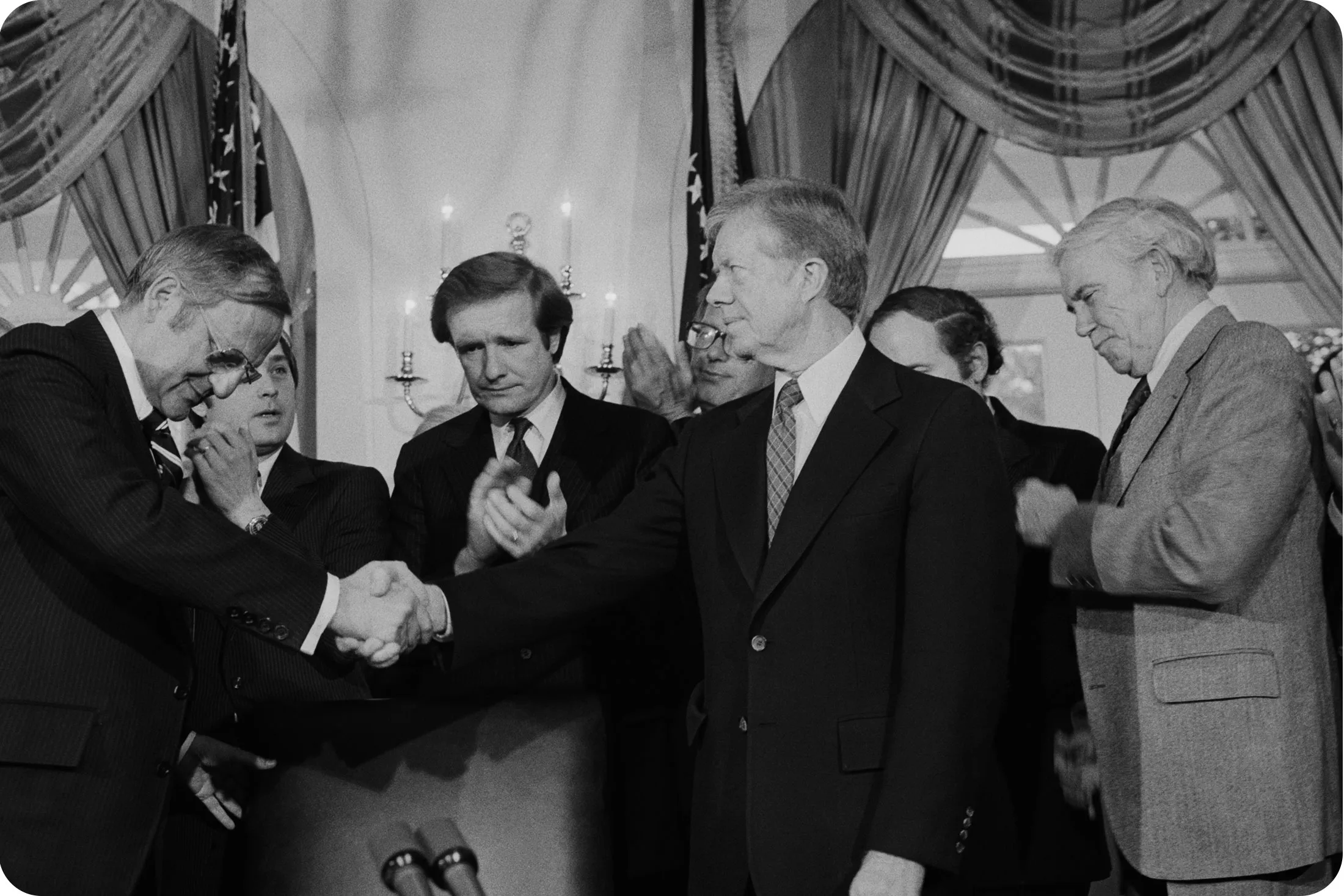 克莱斯勒总裁李·艾柯卡(左)在1980年1月7日卡特总统签署克莱斯勒援助法案成为法律后向美国总统吉米·卡特(中)鞠躬。鼓掌的是密歇根州的民主党参议员唐纳德·W·里格尔(在艾柯卡和卡特之间)和UAW主席道格拉斯·弗雷泽(右)。摄影师:贝特曼档案1979-81:弗雷泽领导与克莱斯勒的工资和福利让步谈判——加上来自美国政府的贷款担保以及来自贷方、经销商和供应商的帮助——使这家汽车制造商避免破产。“我们在13个月内三次向会员进行批准,每份合同都比之前的更糟,”弗雷泽在2001年《商业周刊》采访中说。“我们真的不知道[克莱斯勒]是否会生存下来。”