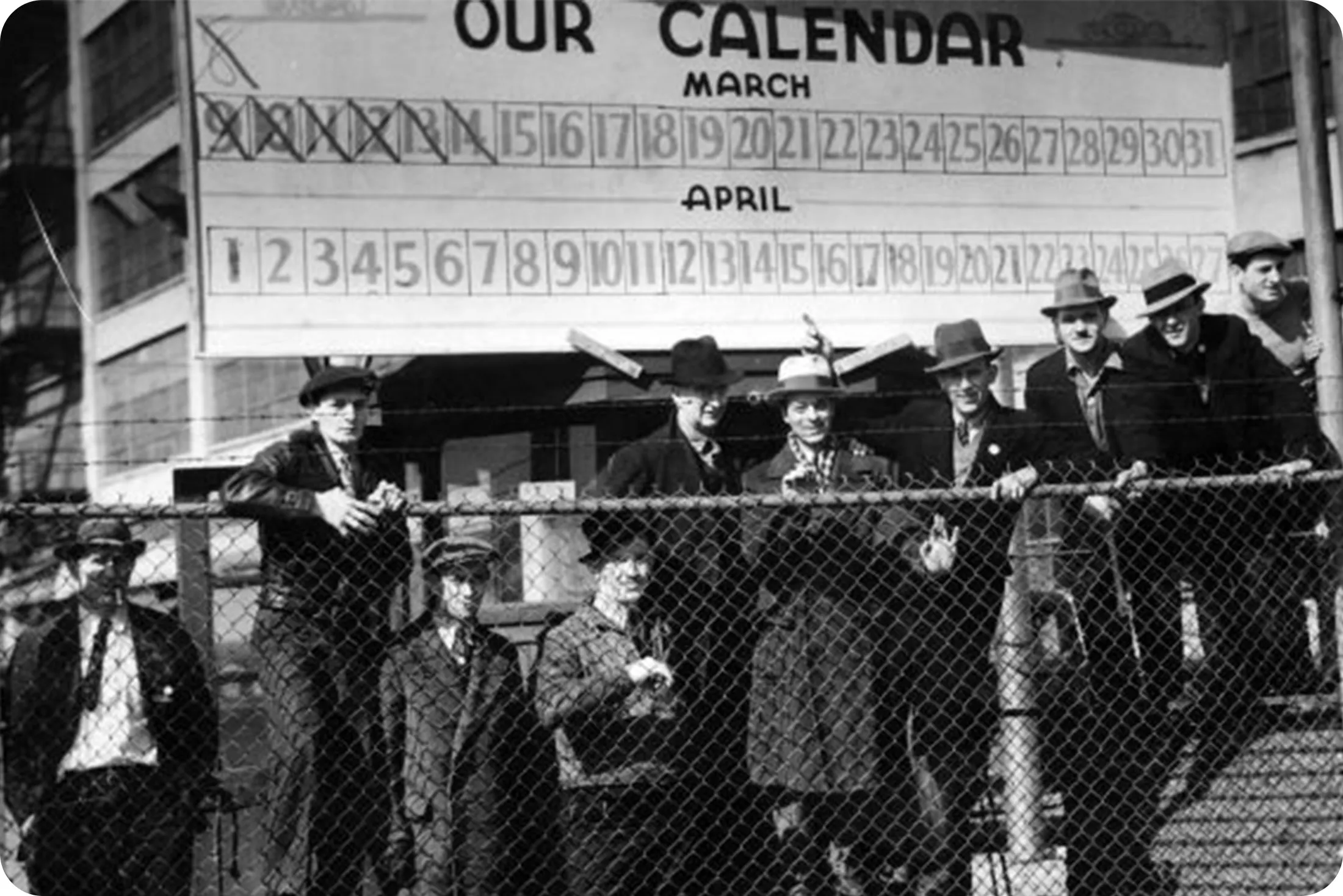 工人在1937年克莱斯勒静坐罢工期间聚集在道奇主厂的罢工日历前。**1937年:**1937年2月11日,静坐罢工结束,通用汽车成为底特律三大汽车制造商中第一个承认联合汽车工人协会为其制造员工代表的公司。第一份合同提供了更高的工资和改善的工厂条件。克莱斯勒在其底特律工厂的静坐罢工后也承认了联合汽车工人协会。