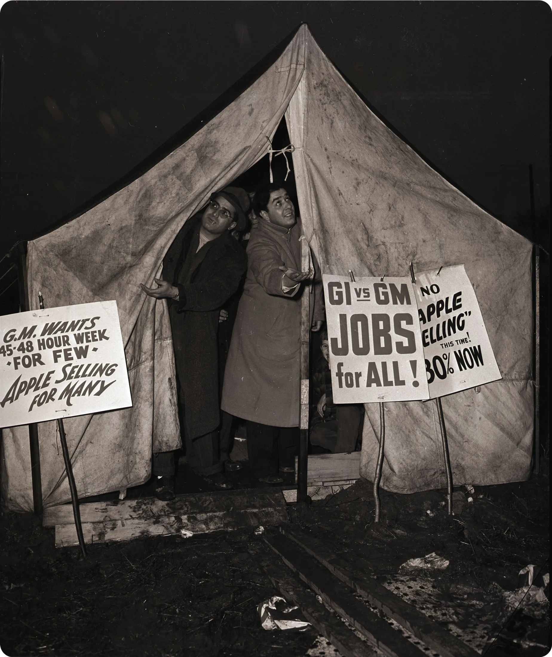 乔治·谢里南,底特律通用汽车柴油厂地方163的罢工队长,以及前G.I.约翰·斯卡帕,透过他们的帐篷查看1945年11月28日在雨中罢工是否值得。摄影师:贝特曼档案**1945-46年:**鲁瑟,现在是UAW副主席和通用汽车部门负责人,希望在二战后为工人争取30%的工资增长。他还希望通用汽车在不提高车辆价格的情况下实施加薪。公司拒绝了,因此鲁瑟要求公司“公开账本”,以证明其能够同时承担这两项费用。通用汽车再次拒绝,并提供相当于10%加薪的方案,但价格更高。工会拒绝了这个提议,并于1945年11月21日开始了为期113天的全国罢工。哈里·杜鲁门总统任命一个委员会,根据战后工资价格政策提出建议;该小组表示通用汽车可以在不提高价格的情况下,每小时提高19.5美分,约17.5%。
