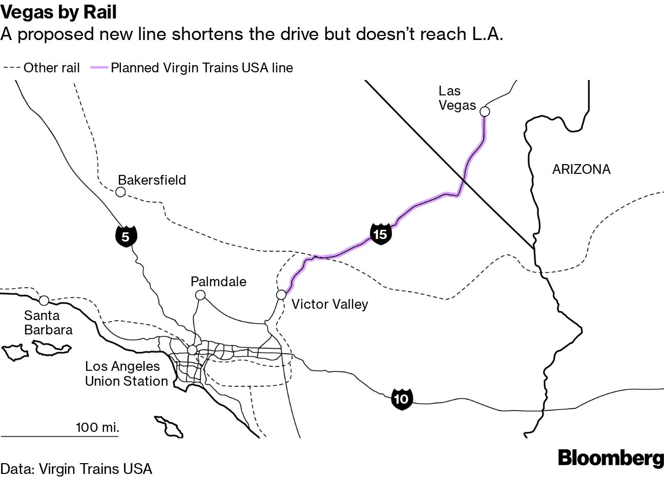 **赶快把加州人送到掷骰子桌上。**由堡垒支持的维珍火车美国公司计划建设一条170英里高速铁路,起点距离洛杉矶90英里,终点在拉斯维加斯。单程票价为60美元,行程持续90分钟。维珍火车计划为这项48亿美元的项目出售高达42亿美元的免税债务,预计将在2023年开始,历时三年。
