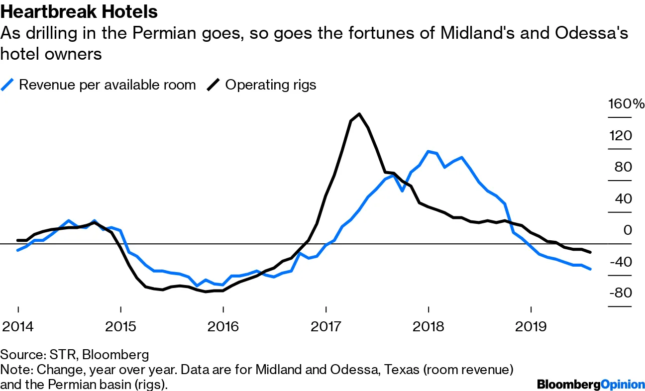 德克萨斯州米德兰和奥德萨的酒店房价下跌是 页岩气行业即将面临困难的迹象, 写道 利亚姆·丹宁。